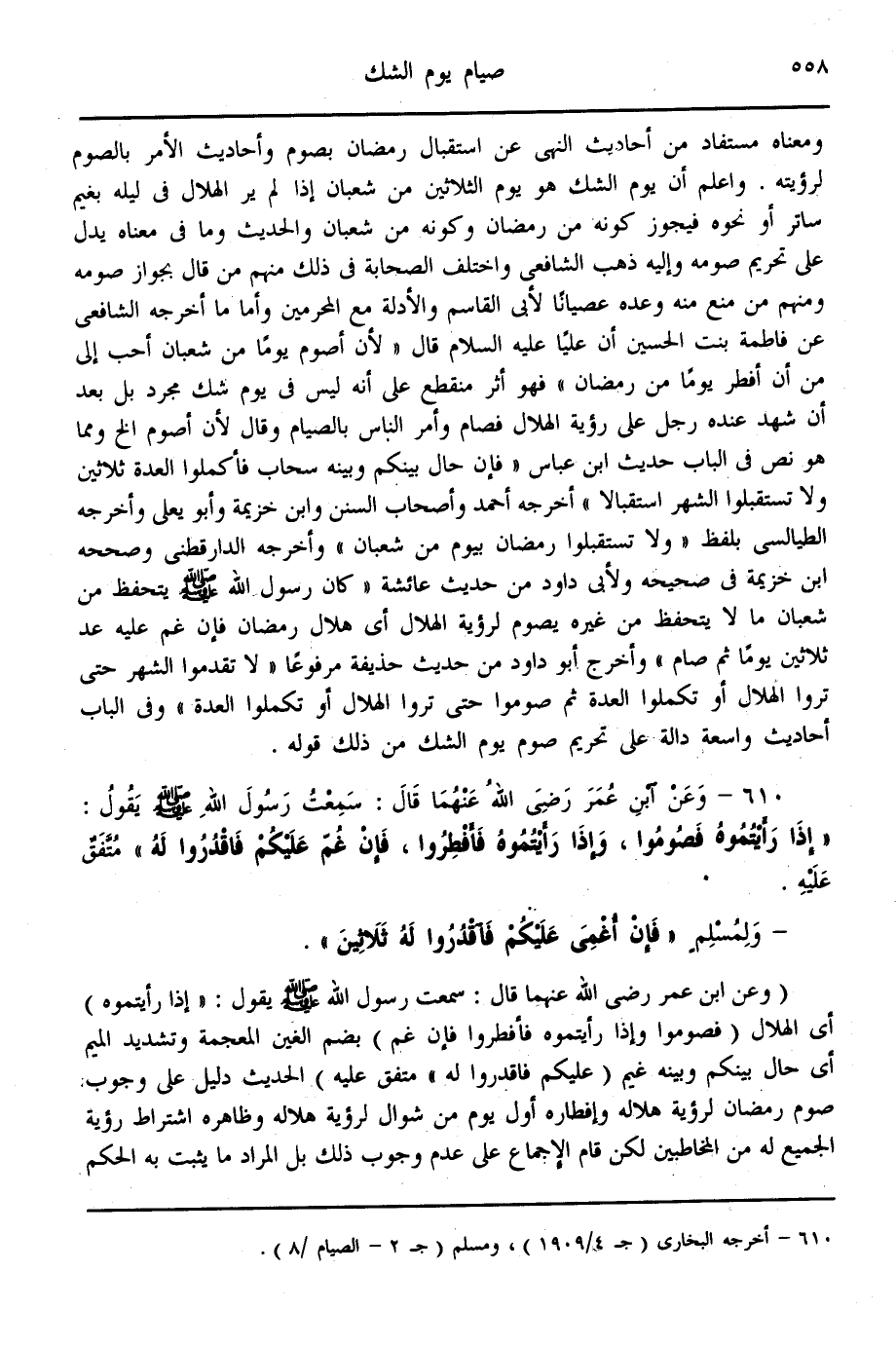 . (وَعَنْ ابْنِ عُمَرَ - رَضِيَ اللَّهُ عَنْهُمَا - قَالَ: سَمِعْت رَسُولَ اللَّهِ - صَلَّى اللَّهُ عَلَيْهِ وَسَلَّمَ - يَقُولُ: «إذَا رَأَيْتُمُوهُ أَيْ الْهِلَالَ فَصُومُوا وَإِذَا رَأَيْتُمُوهُ فَأَفْطِرُوا فَإِنْ غُمَّ بِضَمِّ الْغَيْنِ الْمُعْجَمَةِ وَتَشْدِيدِ الْمِيمِ أَيْ حَالَ بَيْنَكُمْ وَبَيْنَهُ غَيْمٌ عَلَيْكُمْ فَاقْدُرُوا لَهُ» مُتَّفَقٌ عَلَيْهِ) الْحَدِيثُ دَلِيلٌ عَلَى وُجُوبِ صَوْمِ رَمَضَانَ لِرُؤْيَةِ هِلَالِهِ وَإِفْطَارِهِ أَوَّلَ يَوْمٍ مِنْ شَوَّالٍ لِرُؤْيَةِ هِلَالِهِ وَظَاهِرُهُ اشْتِرَاطُ رُؤْيَةِ الْجَمِيعِ لَهُ مِنْ الْمُخَاطَبِينَ لَكِنْ قَامَ الْإِجْمَاعُ عَلَى عَدَمِ وُجُوبِ ذَلِكَ بَلْ الْمُرَادُ مَا يَثْبُتُ بِهِ الْحُكْمُ
