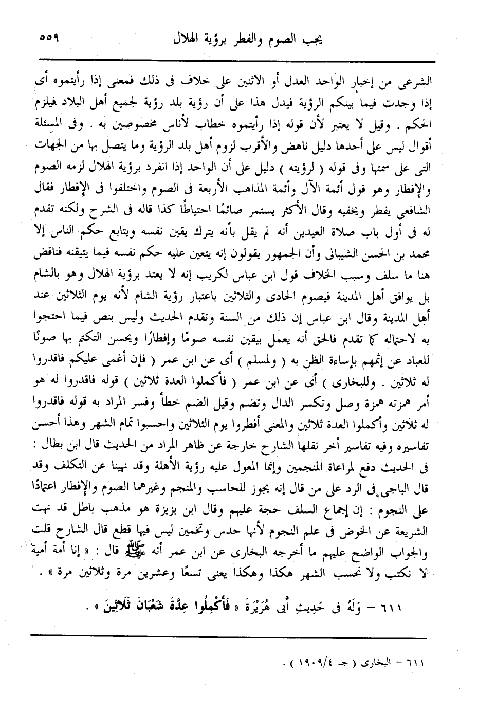 ـــــــــــــــــــــــــــــQالشَّرْعِيُّ مِنْ إخْبَارِ الْوَاحِدِ الْعَدْلِ أَوْ الِاثْنَيْنِ عَلَى خِلَافٍ فِي ذَلِكَ فَمَعْنَى إذَا رَأَيْتُمُوهُ أَيْ إذَا وُجِدَتْ فِيمَا بَيْنَكُمْ الرُّؤْيَةُ، فَيَدُلُّ هَذَا عَلَى أَنَّ رُؤْيَةَ بَلَدٍ رُؤْيَةٌ لِجَمِيعِ أَهْلِ الْبِلَادِ فَيَلْزَمُ الْحُكْمُ. وَقِيلَ: لَا يُعْتَبَرُ؛ لِأَنَّ قَوْلَهُ: " إذَا رَأَيْتُمُوهُ " خِطَابٌ لِأُنَاسٍ مَخْصُوصِينَ بِهِ.