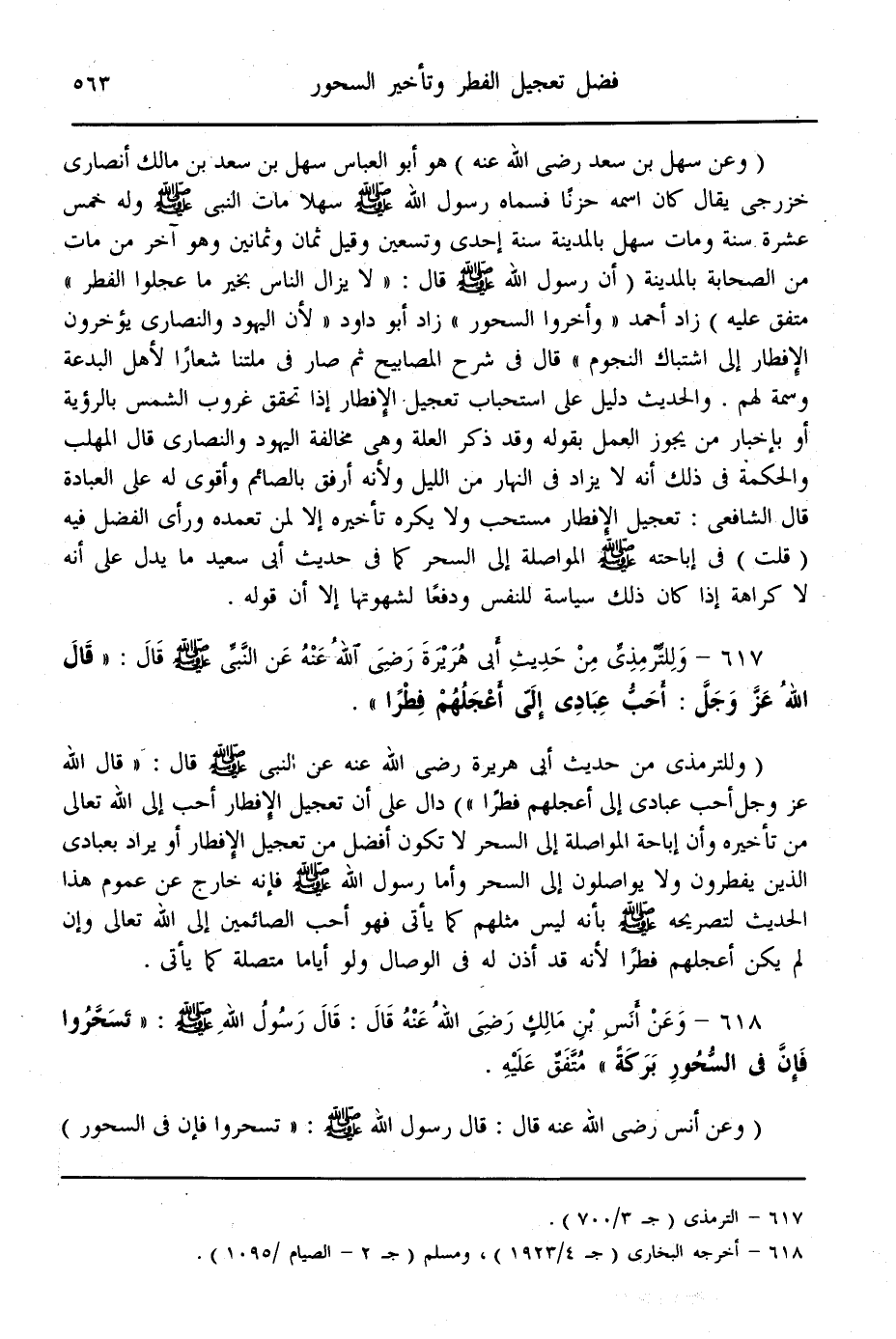(617) - وَلِلتِّرْمِذِيِّ مِنْ حَدِيثِ أَبِي هُرَيْرَةَ - رَضِيَ اللَّهُ عَنْهُ - عَنْ النَّبِيِّ - صَلَّى اللَّهُ عَلَيْهِ وَسَلَّمَ - قَالَ: «قَالَ اللَّهُ عَزَّ وَجَلَّ: أَحَبُّ عِبَادِي إلَيَّ أَعْجَلُهُمْ فِطْرًا» وَلِلتِّرْمِذِيِّ مِنْ حَدِيثِ أَبِي هُرَيْرَةَ - رَضِيَ اللَّهُ عَنْهُ - عَنْ النَّبِيِّ - صَلَّى اللَّهُ عَلَيْهِ وَسَلَّمَ - قَالَ: «قَالَ اللَّهُ عَزَّ وَجَلَّ: أَحَبُّ عِبَادِي إلَيَّ أَعْجَلُهُمْ فِطْرًا» دَالٌّ عَلَى أَنَّ تَعْجِيلَ الْإِفْطَارِ أَحَبُّ إلَى اللَّهِ تَعَالَى مِنْ تَأْخِيرِهِ وَأَنَّ إبَاحَةَ الْمُوَاصَلَةِ إلَى السَّحَرِ لَا تَكُونُ أَفْضَلَ مِنْ تَعْجِيلِ الْإِفْطَارِ أَوْ يُرَادُ بِعِبَادِي الَّذِينَ يُفْطِرُونَ وَلَا يُوَاصِلُونَ إلَى السَّحَرِ وَأَمَّا رَسُولُ اللَّهِ - صَلَّى اللَّهُ عَلَيْهِ وَسَلَّمَ - فَإِنَّهُ خَارِجٌ عَنْ عُمُومِ هَذَا الْحَدِيثِ لِتَصْرِيحِهِ - صَلَّى اللَّهُ عَلَيْهِ وَسَلَّمَ - بِأَنَّهُ لَيْسَ مِثْلَهُمْ كَمَا يَأْتِي فَهُوَ أَحَبُّ الصَّائِمِينَ إلَى اللَّهِ تَعَالَى وَإِنْ لَمْ يَكُنْ أَعْجَلَهُمْ فِطْرًا؛ لِأَنَّهُ قَدْ أُذِنَ لَهُ فِي الْوِصَالِ وَلَوْ أَيَّامًا مُتَّصِلَةً كَمَا يَأْتِي.