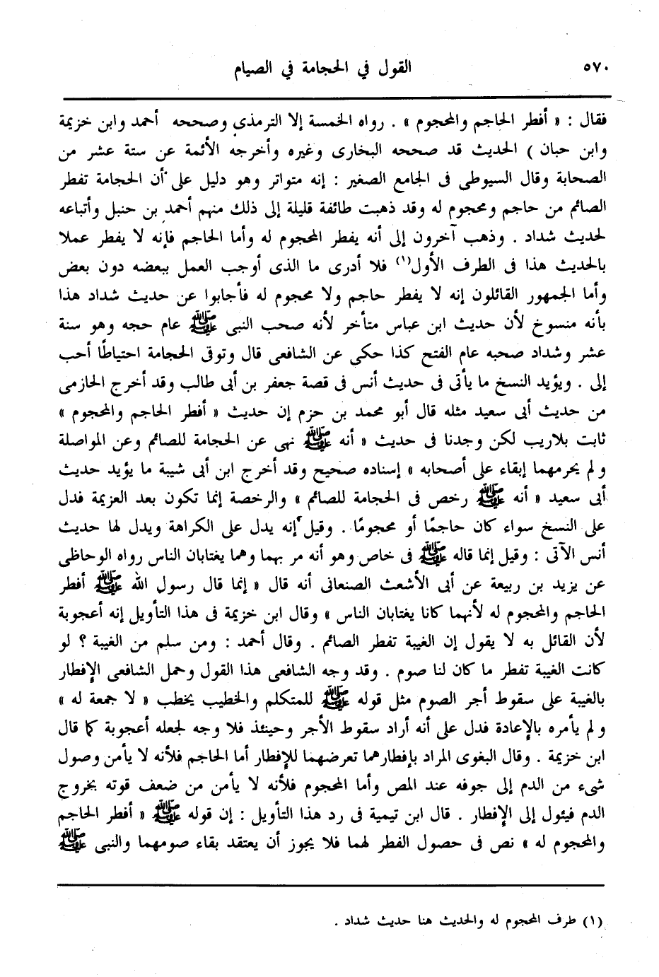 قَالَ ابْنُ تَيْمِيَّةَ فِي رَدِّ هَذَا التَّأْوِيلِ: إنَّ قَوْلَهُ - صَلَّى اللَّهُ عَلَيْهِ وَسَلَّمَ - «أَفْطَرَ الْحَاجِمُ وَالْمَحْجُومُ لَهُ» نَصٌّ فِي حُصُولِ الْفِطْرِ لَهُمَا فَلَا يَجُوزُ أَنْ يُعْتَقَدَ بَقَاءُ صَوْمِهِمَا وَالنَّبِيُّ - صَلَّى اللَّهُ عَلَيْهِ وَسَلَّمَ -