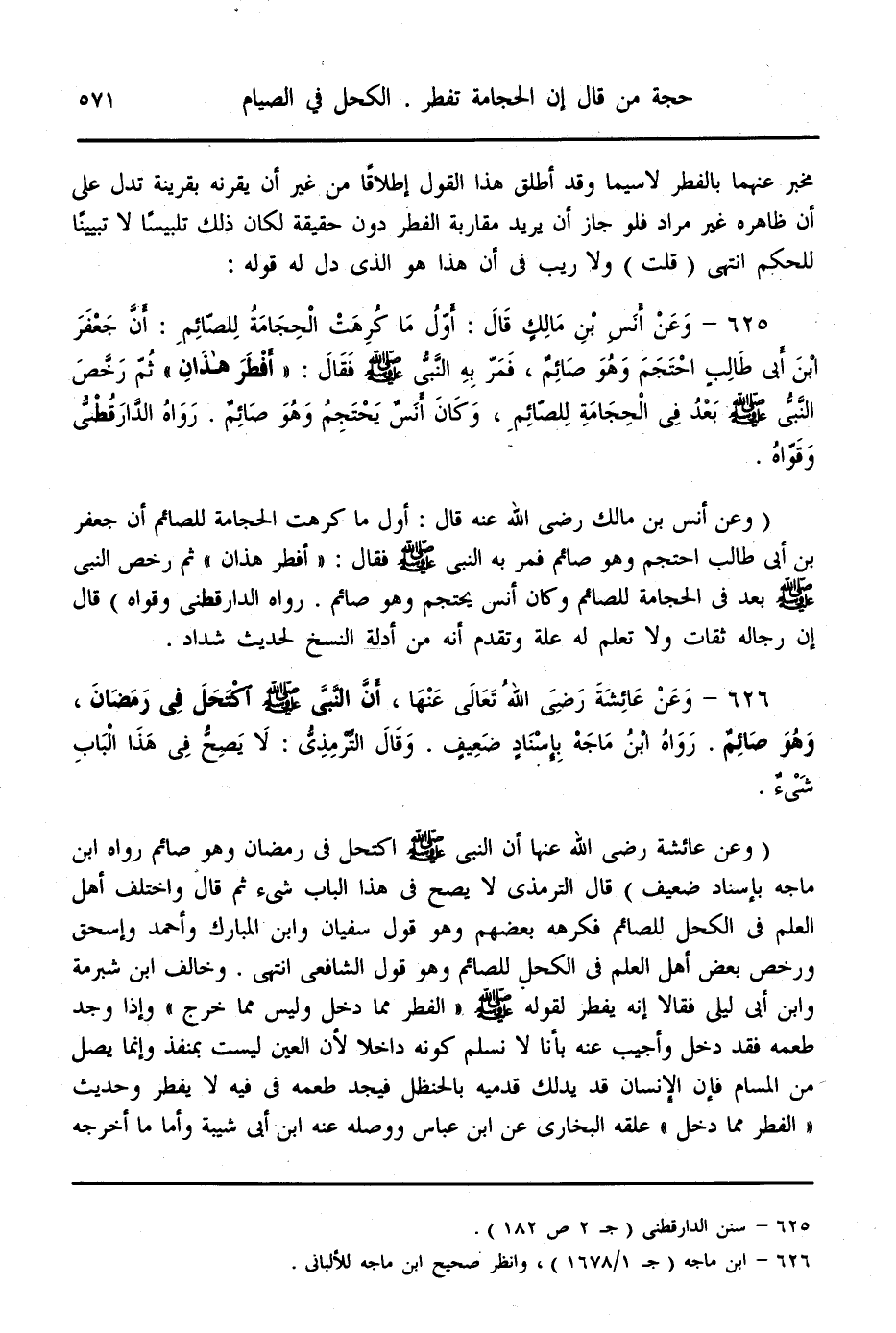 (625) - «وَعَنْ أَنَسِ بْنِ مَالِكٍ قَالَ: أَوَّلُ مَا كُرِهَتْ الْحِجَامَةُ لِلصَّائِمِ: أَنَّ جَعْفَرَ بْنَ أَبِي طَالِبٍ احْتَجَمَ وَهُوَ صَائِمٌ، فَمَرَّ بِهِ النَّبِيُّ - صَلَّى اللَّهُ عَلَيْهِ وَسَلَّمَ - فَقَالَ: أَفْطَرَ هَذَانِ ثُمَّ رَخَّصَ النَّبِيُّ - صَلَّى اللَّهُ عَلَيْهِ وَسَلَّمَ - بَعْدُ فِي الْحِجَامَةِ لِلصَّائِمِ، وَكَانَ أَنَسٌ يَحْتَجِمُ وَهُوَ صَائِمٌ» . رَوَاهُ الدَّارَقُطْنِيُّ وَقَوَّاهُ