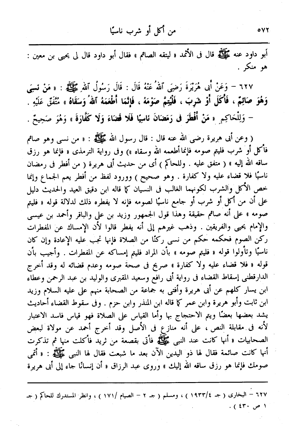 (627) - وَعَنْ أَبِي هُرَيْرَةَ - رَضِيَ اللَّهُ عَنْهُ - قَالَ: قَالَ رَسُولُ اللَّهِ - صَلَّى اللَّهُ عَلَيْهِ وَسَلَّمَ -: «مَنْ نَسِيَ وَهُوَ صَائِمٌ، فَأَكَلَ أَوْ شَرِبَ، فَلْيُتِمَّ صَوْمَهُ، فَإِنَّمَا أَطْعَمَهُ اللَّهُ وَسَقَاهُ» مُتَّفَقٌ عَلَيْهِ - وَلِلْحَاكِمِ «مَنْ أَفْطَرَ فِي رَمَضَانَ نَاسِيًا فَلَا قَضَاءَ وَلَا كَفَّارَةَ» وَهُوَ صَحِيحٌ