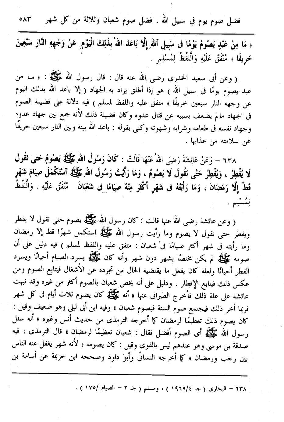 (638) - وَعَنْ عَائِشَةَ - رَضِيَ اللَّهُ عَنْهَا - قَالَتْ: «كَانَ رَسُولُ اللَّهِ - صَلَّى اللَّهُ عَلَيْهِ وَسَلَّمَ - يَصُومُ حَتَّى نَقُولَ لَا يُفْطِرُ، وَيُفْطِرُ حَتَّى نَقُولَ: لَا يَصُومُ، وَمَا رَأَيْت رَسُولَ اللَّهِ - صَلَّى اللَّهُ عَلَيْهِ وَسَلَّمَ - اسْتَكْمَلَ صِيَامَ شَهْرٍ قَطُّ إلَّا رَمَضَانَ، وَمَا رَأَيْته فِي شَهْرٍ أَكْثَرَ مِنْهُ صِيَامًا فِي شَعْبَانَ» مُتَّفَقٌ عَلَيْهِ. وَاللَّفْظُ لِمُسْلِمٍ
