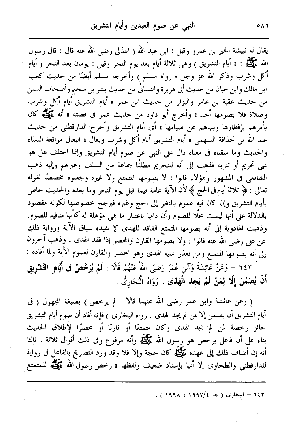 فَإِنَّهُ أَفَادَ أَنَّ صَوْمَ أَيَّامِ التَّشْرِيقِ جَائِزٌ رُخْصَةً لِمَنْ لَمْ يَجِدْ الْهَدْيَ وَكَانَ مُتَمَتِّعًا أَوْ قَارِنًا أَوْ مُحْصَرًا لِإِطْلَاقِ الْحَدِيثِ بِنَاءً عَلَى أَنَّ فَاعِلَ يُرَخَّصُ هُوَ رَسُولُ اللَّهِ - صَلَّى اللَّهُ عَلَيْهِ وَسَلَّمَ - وَأَنَّهُ مَرْفُوعٌ وَفِي ذَلِكَ أَقْوَالٌ ثَلَاثَةٌ.