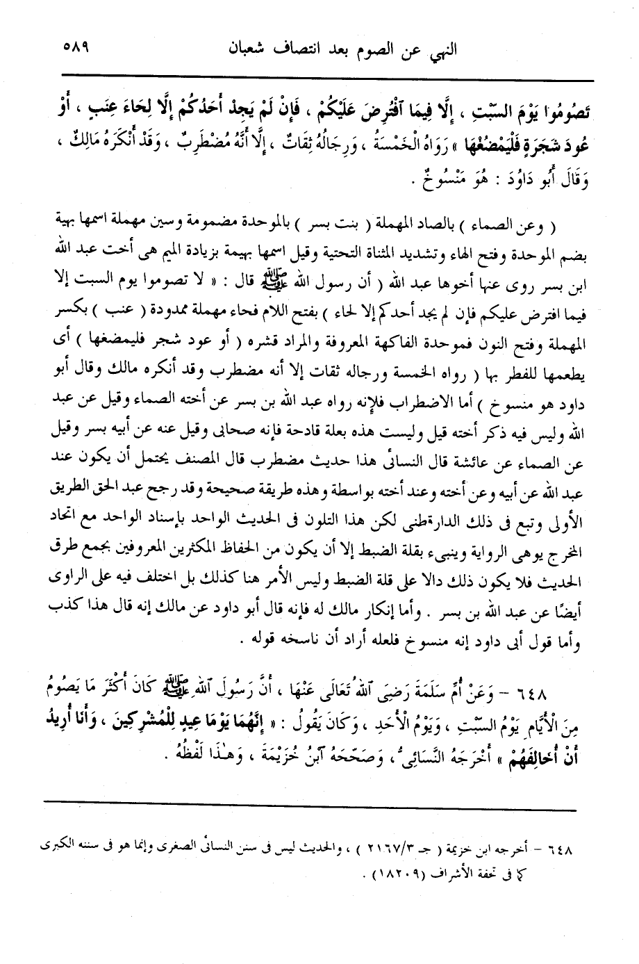 تَصُومُوا يَوْمَ السَّبْتِ إلَّا فِيمَا اُفْتُرِضَ عَلَيْكُمْ فَإِنْ لَمْ يَجِدْ أَحَدُكُمْ إلَّا لِحَاءَ عِنَبٍ أَوْ عُودَ شَجَرَةٍ فَلْيَمْضُغْهَا» رَوَاهُ الْخَمْسَةُ وَرِجَالُهُ ثِقَاتٌ إلَّا أَنَّهُ مُضْطَرِبٌ وَقَدْ أَنْكَرَهُ مَالِكٌ وَقَالَ أَبُو دَاوُد: هُوَ مَنْسُوخٌ