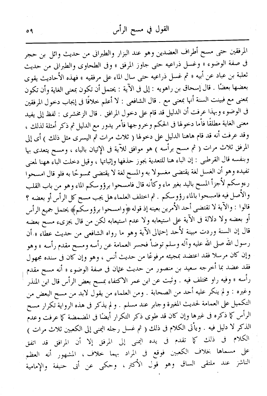 [ثُمَّ مَسَحَ بِرَأْسِهِ] هُوَ مُوَافِقٌ لِلْآيَةِ فِي الْإِتْيَانِ بِالْبَاءِ، وَمَسَحَ يَتَعَدَّى بِهَا وَبِنَفْسِهِ؛ قَالَ الْقُرْطُبِيُّ: إنَّ الْبَاءَ هُنَا لِلتَّعْدِيَةِ، يَجُوزُ حَذْفُهَا وَإِثْبَاتُهَا، وَقِيلَ: دَخَلَتْ الْبَاءُ هَاهُنَا لِمَعْنًى تُفِيدُهُ وَهُوَ: أَنَّ الْغَسْلَ لُغَةً يَقْتَضِي مَغْسُولًا بِهِ، وَالْمَسْحَ لُغَةً لَا يَقْتَضِي مَمْسُوحًا بِهِ، فَلَوْ قَالَ: امْسَحُوا رُءُوسَكُمْ - لَأَجْزَأَ الْمَسْحُ بِالْيَدِ بِغَيْرِ مَاءٍ، وَكَأَنَّهُ قَالَ: فَامْسَحُوا بِرُءُوسِكُمْ الْمَاءَ، وَهُوَ مِنْ بَابِ الْقَلْبِ، وَالْأَصْلُ فِيهِ: فَامْسَحُوا بِالْمَاءِ رُءُوسَكُمْ. ثُمَّ اخْتَلَفَ الْعُلَمَاءُ: هَلْ يَجِبُ مَسْحُ كُلِّ الرَّأْسِ أَوْ بَعْضِهِ؟ قَالُوا: الْآيَةُ لَا تَقْتَضِي أَحَدَ الْأَمْرَيْنِ بِعَيْنِهِ، إذْ قَوْلُهُ: {وَامْسَحُوا بِرُءُوسِكُمْ} [المائدة: 6] يَحْتَمِلُ جَمِيعَ الرَّأْسِ، أَوْ بَعْضَهُ، وَلَا دَلَالَةَ فِي الْآيَةِ عَلَى اسْتِيعَابِهِ، وَلَا عَدَمِ اسْتِيعَابِهِ لَكِنَّ مَنْ قَالَ: يُجْزِئُ مَسْحُ بَعْضِهِ قَالَ: إنَّ السُّنَّةَ وَرَدَتْ مُبَيِّنَةً لِأَحَدِ احْتِمَالَيْ الْآيَةِ، وَهُوَ مَا رَوَاهُ الشَّافِعِيُّ مِنْ حَدِيثِ عَطَاءٍ: «أَنَّ رَسُولَ اللَّهِ - صَلَّى اللَّهُ عَلَيْهِ وَسَلَّمَ - تَوَضَّأَ فَحَسَرَ الْعِمَامَةَ عَنْ رَأْسِهِ وَمَسَحَ مُقَدَّمَ رَأْسِهِ» وَهُوَ وَإِنْ كَانَ مُرْسَلًا، فَقَدْ اعْتَضَدَ بِمَجِيئِهِ مَرْفُوعًا مِنْ حَدِيثِ " أَنَسٍ، وَهُوَ وَإِنْ كَانَ فِي سَنَدِهِ مَجْهُولٌ، فَقَدْ عُضِّدَ بِمَا أَخْرَجَهُ سَعِيدُ بْنُ مَنْصُورٍ، مِنْ حَدِيثِ " عُثْمَانَ " فِي صِفَةِ الْوُضُوءِ: «أَنَّهُ مَسَحَ مُقَدَّمَ رَأْسِهِ» وَفِيهِ رَاوٍ مُخْتَلَفٍ فِيهِ.