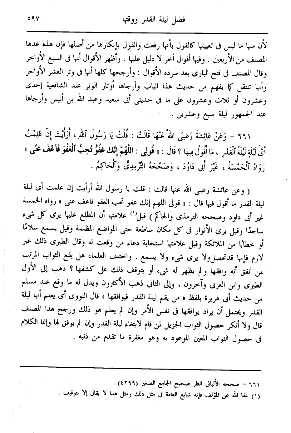 (661) - وَعَنْ عَائِشَةَ - رَضِيَ اللَّهُ عَنْهَا - قَالَتْ: «قُلْت: يَا رَسُولَ اللَّهِ، أَرَأَيْت إنْ عَلِمْت أَيُّ لَيْلَةٍ لَيْلَةُ الْقَدْرِ، مَا أَقُولُ فِيهَا؟ قَالَ: قُولِي: اللَّهُمَّ إنَّك عَفُوٌّ تُحِبُّ الْعَفْوَ فَاعْفُ عَنِّي» رَوَاهُ الْخَمْسَةُ، غَيْرَ أَبِي دَاوُد، وَصَحَّحَهُ التِّرْمِذِيُّ وَالْحَاكِمُ