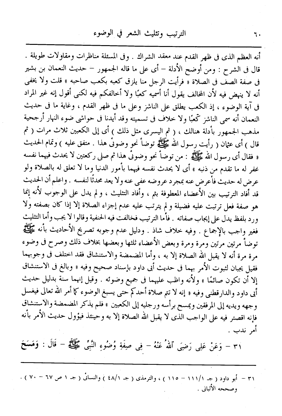 (31) - وَعَنْ عَلِيٍّ - رَضِيَ اللَّهُ عَنْهُ - فِي «صِفَةِ وُضُوءِ النَّبِيِّ - صَلَّى اللَّهُ عَلَيْهِ وَسَلَّمَ - قَالَ: وَمَسَحَ