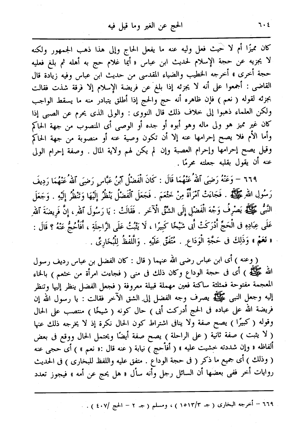 (669) - وَعَنْهُ - رَضِيَ اللَّهُ عَنْهُمَا - قَالَ: «كَانَ الْفَضْلُ بْنُ عَبَّاسٍ - رَضِيَ اللَّهُ عَنْهُمَا - رَدِيفَ رَسُولِ اللَّهِ - صَلَّى اللَّهُ عَلَيْهِ وَسَلَّمَ - فَجَاءَتْ امْرَأَةٌ مِنْ خَثْعَمَ. فَجَعَلَ الْفَضْلُ يَنْظُرُ إلَيْهَا وَتَنْظُرُ إلَيْهِ. وَجَعَلَ النَّبِيُّ - صَلَّى اللَّهُ عَلَيْهِ وَسَلَّمَ - يَصْرِفُ وَجْهَ الْفَضْلِ إلَى الشِّقِّ الْآخَرِ. فَقَالَتْ: يَا رَسُولَ اللَّهِ، إنَّ فَرِيضَةَ اللَّهِ عَلَى عِبَادِهِ فِي الْحَجِّ أَدْرَكَتْ أَبِي شَيْخًا كَبِيرًا، لَا يَثْبُتُ عَلَى الرَّاحِلَةِ، أَفَأَحُجُّ عَنْهُ؟ قَالَ: نَعَمْ وَذَلِكَ فِي حَجَّةِ الْوَدَاعِ» . مُتَّفَقٌ عَلَيْهِ. وَاللَّفْظُ لِلْبُخَارِيِّ