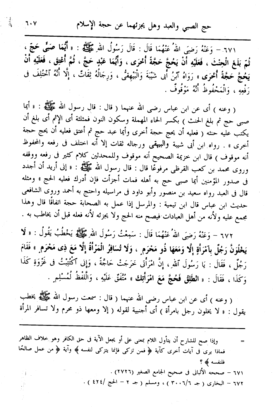 (671) - وَعَنْهُ - رَضِيَ اللَّهُ عَنْهُمَا - قَالَ: قَالَ رَسُولُ اللَّهِ - صَلَّى اللَّهُ عَلَيْهِ وَسَلَّمَ -: «أَيُّمَا صَبِيٍّ حَجَّ، ثُمَّ بَلَغَ الْحِنْثَ، فَعَلَيْهِ أَنْ يَحُجَّ حَجَّةً أُخْرَى، وَأَيُّمَا عَبْدٍ حَجَّ، ثُمَّ أَعْتَقَ، فَعَلَيْهِ أَنْ يَحُجَّ حَجَّةً أُخْرَى» رَوَاهُ ابْنُ أَبِي شَيْبَةَ وَالْبَيْهَقِيُّ، وَرِجَالُهُ ثِقَاتٌ، إلَّا أَنَّهُ اُخْتُلِفَ فِي رَفْعِهِ، وَالْمَحْفُوظُ أَنَّهُ مَوْقُوفٌ