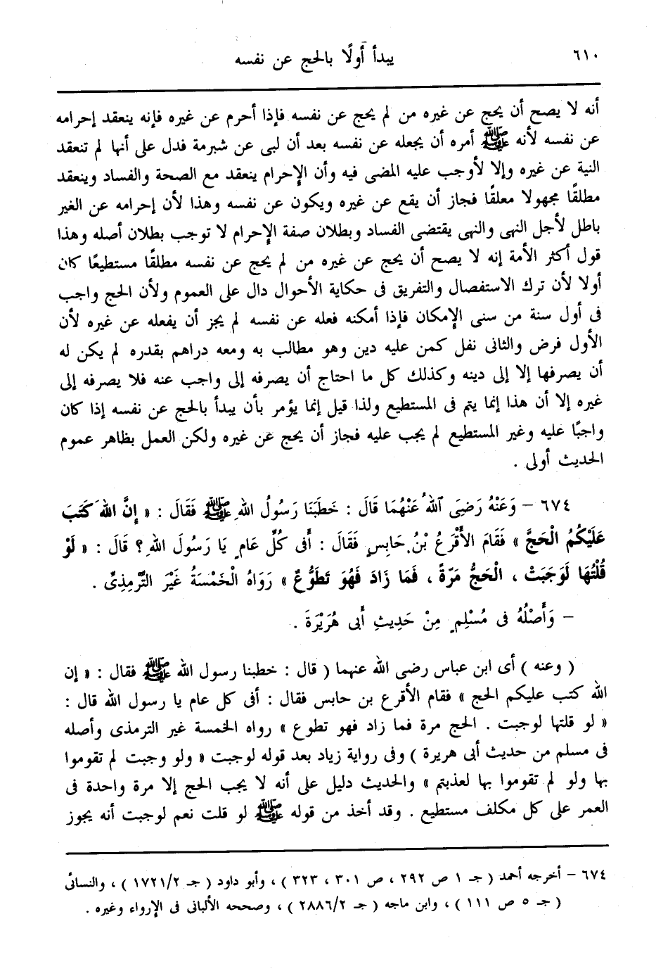 (674) - وَعَنْهُ - رَضِيَ اللَّهُ عَنْهُمَا - قَالَ: خَطَبَنَا رَسُولُ اللَّهِ - صَلَّى اللَّهُ عَلَيْهِ وَسَلَّمَ - فَقَالَ: «إنَّ اللَّهَ كَتَبَ عَلَيْكُمْ الْحَجَّ فَقَامَ الْأَقْرَعُ بْنُ حَابِسٍ فَقَالَ: أَفِي كُلِّ عَامٍ يَا رَسُولَ اللَّهِ؟ قَالَ: لَوْ قُلْتهَا لَوَجَبَتْ، الْحَجُّ مَرَّةً، فَمَا زَادَ فَهُوَ تَطَوُّعٌ» رَوَاهُ الْخَمْسَةُ غَيْرَ التِّرْمِذِيِّ. وَأَصْلُهُ فِي مُسْلِمٍ مِنْ حَدِيثِ أَبِي هُرَيْرَةَ