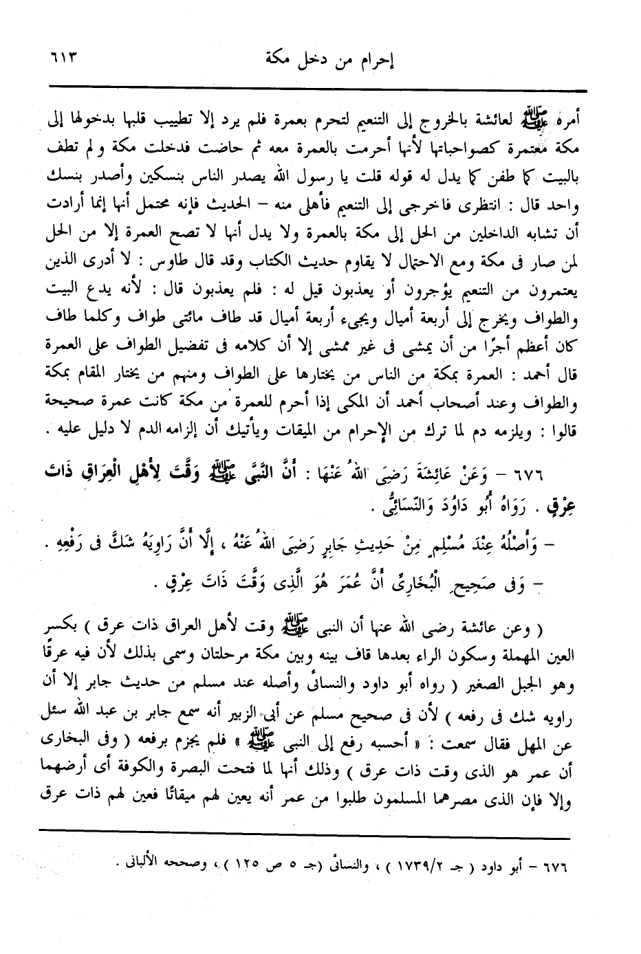 (676) - وَعَنْ عَائِشَةَ - رَضِيَ اللَّهُ عَنْهَا -: «أَنَّ النَّبِيَّ - صَلَّى اللَّهُ عَلَيْهِ وَسَلَّمَ - وَقَّتَ؛ لِأَهْلِ الْعِرَاقِ ذَاتَ عِرْقٍ.» رَوَاهُ أَبُو دَاوُد وَالنَّسَائِيُّ وَأَصْلُهُ عِنْدَ مُسْلِمٍ مِنْ حَدِيثِ جَابِرٍ - رَضِيَ اللَّهُ عَنْهُ -، إلَّا أَنَّ رَاوِيهِ شَكَّ فِي رَفْعِهِ. وَفِي صَحِيحِ الْبُخَارِيِّ أَنَّ عُمَرَ هُوَ الَّذِي وَقَّتَ ذَاتَ عِرْقٍ وَعَنْ عَائِشَةَ - رَضِيَ اللَّهُ عَنْهَا - «أَنَّ النَّبِيَّ - صَلَّى اللَّهُ عَلَيْهِ وَسَلَّمَ - وَقَّتَ لِأَهْلِ الْعِرَاقِ ذَاتَ عِرْقٍ» بِكَسْرِ الْعَيْنِ الْمُهْمَلَةِ وَسُكُونِ الرَّاءِ بَعْدَهَا قَافٌ بَيْنَهُ وَبَيْنَ مَكَّةَ مَرْحَلَتَانِ وَسُمِّيَ بِذَلِكَ؛ لِأَنَّ فِيهِ عِرْقًا وَهُوَ الْجَبَلُ الصَّغِيرُ (رَوَاهُ أَبُو دَاوُد وَالنَّسَائِيُّ وَأَصْلُهُ عِنْدَ مُسْلِمٍ مِنْ حَدِيثِ جَابِرٍ إلَّا أَنَّ رَاوِيهِ شَكَّ فِي رَفْعِهِ) ؛ لِأَنَّ فِي صَحِيحِ مُسْلِمٍ عَنْ أَبِي الزُّبَيْرِ أَنَّهُ سَمِعَ جَابِرَ بْنَ عَبْدِ اللَّهِ سَأَلَ عَنْ الْمَهْلِ فَقَالَ: سَمِعْت: " أَحْسَبُهُ رَفَعَ إلَى النَّبِيِّ - صَلَّى اللَّهُ عَلَيْهِ وَسَلَّمَ - فَلَمْ يَجْزِمْ بِرَفْعِهِ (وَفِي الْبُخَارِيِّ أَنَّ عُمَرَ هُوَ الَّذِي وَقَّتَ ذَاتَ عِرْقٍ) وَذَلِكَ أَنَّهَا لَمَّا فُتِحَتْ الْبَصْرَةُ وَالْكُوفَةُ أَيْ أَرْضُهُمَا وَإِلَّا فَإِنَّ الَّذِي مَصَّرَهُمَا الْمُسْلِمُونَ طَلَبُوا مِنْ عُمَرَ أَنَّهُ يُعَيِّنُ لَهُمْ مِيقَاتًا فَعَيَّنَ لَهُمْ ذَاتَ عِرْقٍ