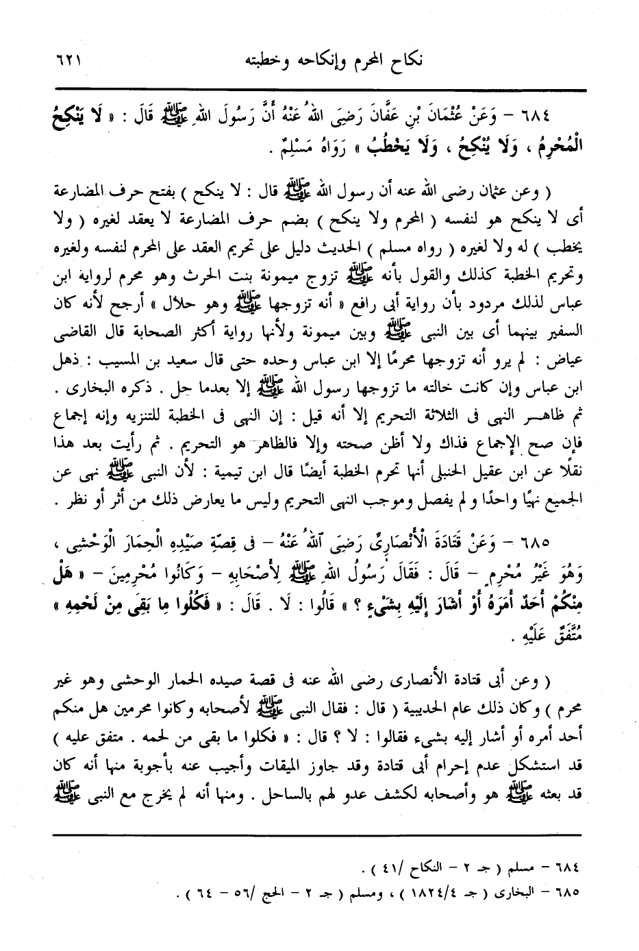 (684) - وَعَنْ عُثْمَانَ بْنِ عَفَّانَ - رَضِيَ اللَّهُ عَنْهُ - أَنَّ رَسُولَ اللَّهِ - صَلَّى اللَّهُ عَلَيْهِ وَسَلَّمَ - قَالَ: «لَا يَنْكِحُ الْمُحْرِمُ، وَلَا يُنْكِحُ، وَلَا يَخْطُبُ» رَوَاهُ مُسْلِمٌ