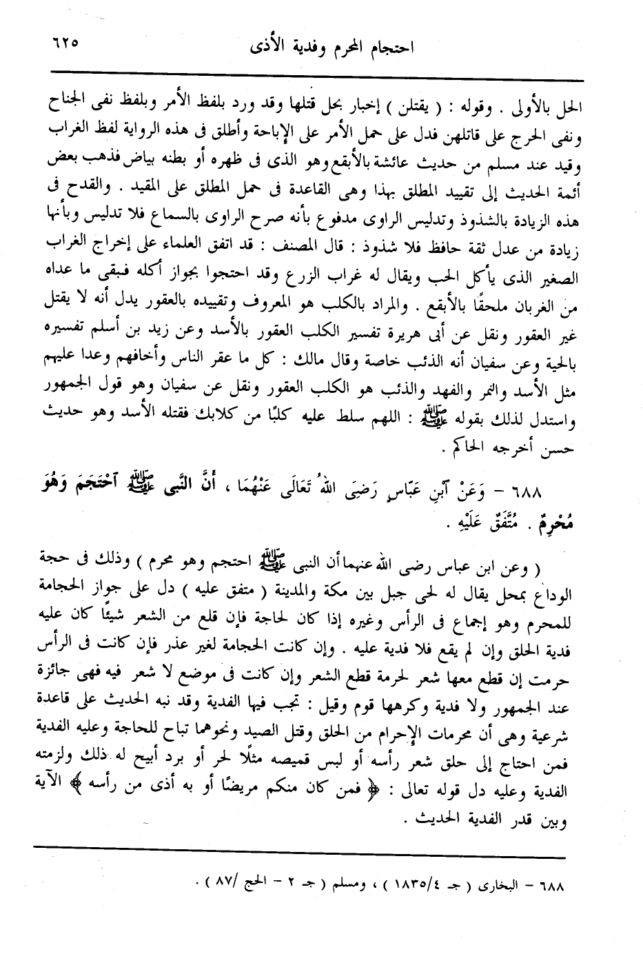 (688) - وَعَنْ ابْنِ عَبَّاسٍ - رَضِيَ اللَّهُ تَعَالَى عَنْهُمَا -، «أَنَّ النَّبِيَّ - صَلَّى اللَّهُ عَلَيْهِ وَسَلَّمَ - احْتَجَمَ وَهُوَ مُحْرِمٌ» . مُتَّفَقٌ عَلَيْهِ.