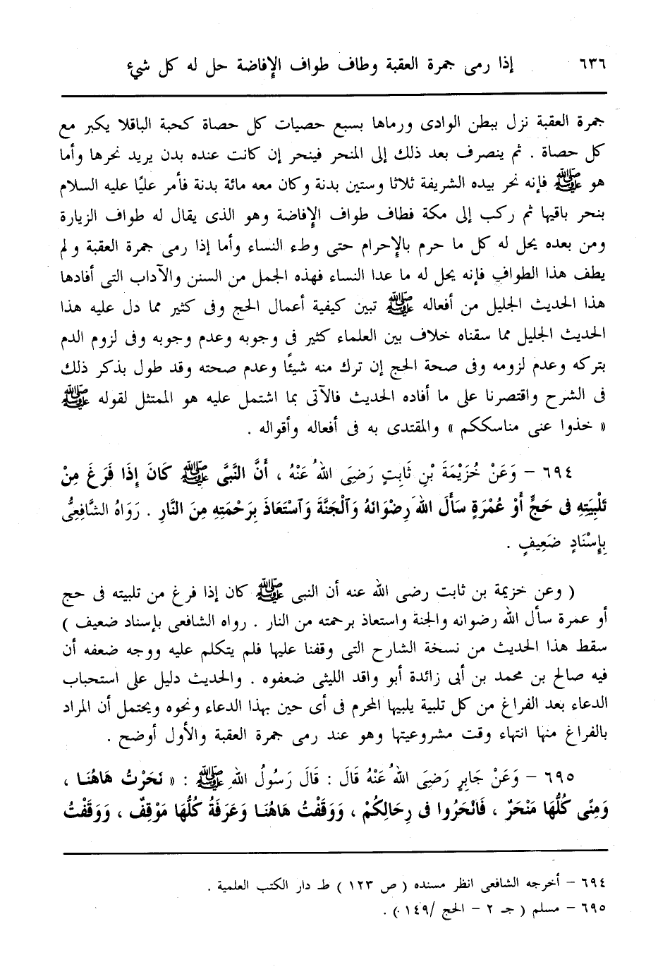(694) - وَعَنْ خُزَيْمَةَ بْنِ ثَابِتٍ - رَضِيَ اللَّهُ عَنْهُ - «أَنَّ النَّبِيَّ - صَلَّى اللَّهُ عَلَيْهِ وَسَلَّمَ - كَانَ إذَا فَرَغَ مِنْ تَلْبِيَتِهِ فِي حَجٍّ أَوْ عُمْرَةٍ سَأَلَ اللَّهَ رِضْوَانَهُ وَالْجَنَّةَ وَاسْتَعَاذَ بِرَحْمَتِهِ مِنْ النَّارِ» . رَوَاهُ الشَّافِعِيُّ. بِإِسْنَادٍ ضَعِيفٍ.