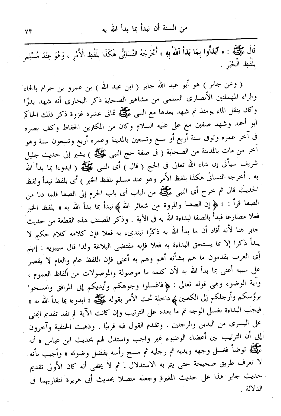 [وَعَنْ " جَابِرٍ " أَبُو عَبْدِ اللَّهِ " جَابِرُ بْنُ عَبْدِ اللَّهِ بْنِ عَمْرِو بْنِ حَرَامٍ ": بِالْحَاءِ وَالرَّاءِ الْمُهْمَلَتَيْنِ، الْأَنْصَارِيُّ، السُّلَمِيُّ، مِنْ مَشَاهِيرِ الصَّحَابَةِ. ذَكَرَ الْبُخَارِيُّ أَنَّهُ شَهِدَ بَدْرًا، وَكَانَ يَنْقُلُ الْمَاءَ يَوْمَئِذٍ، ثُمَّ شَهِدَ بَعْدَهَا مَعَ النَّبِيِّ - صَلَّى اللَّهُ عَلَيْهِ وَسَلَّمَ - ثَمَانِي عَشْرَةَ غَزْوَةً، وَذَكَرَ ذَلِكَ الْحَاكِمُ أَبُو أَحْمَدَ، وَشَهِدَ " صِفِّينَ "، مَعَ " عَلِيٍّ " - عَلَيْهِ السَّلَامُ -، وَكَانَ مِنْ الْمُكْثِرِينَ الْحُفَّاظِ، وَكُفَّ بَصَرُهُ فِي آخِرِ عُمْرِهِ، وَتُوُفِّيَ سَنَةَ أَرْبَعٍ وَتِسْعِينَ بِالْمَدِينَةِ وَعُمْرُهُ أَرْبَعٌ وَتِسْعُونَ سَنَةً، وَهُوَ آخِرُ مَنْ مَاتَ بِالْمَدِينَةِ مِنْ الصَّحَابَةِ. [فِي صِفَة حَجِّ النَّبِيِّ - صَلَّى اللَّهُ عَلَيْهِ وَسَلَّمَ -] يُشِيرُ إلَى حَدِيثٍ جَلِيلٍ شَرِيفٍ سَيَأْتِي إنْ شَاءَ اللَّهُ تَعَالَى فِي الْحَجِّ [قَالَ] أَيْ النَّبِيُّ «- صَلَّى اللَّهُ عَلَيْهِ وَسَلَّمَ -: ابْدَءُوا بِمَا بَدَأَ اللَّهُ بِهِ» أَخْرَجَهُ النَّسَائِيّ هَكَذَا بِلَفْظِ الْأَمْرِ؛ وَهُوَ عِنْدَ مُسْلِمٍ بِلَفْظِ الْخَبَرِ؛ أَيْ بِلَفْظِ نَبْدَأُ وَلَفْظُ الْحَدِيثِ. قَالَ: ثُمَّ «خَرَجَ - أَيْ النَّبِيُّ - صَلَّى اللَّهُ عَلَيْهِ وَسَلَّمَ - مِنْ الْبَابِ: أَيْ بَابِ الْحَرَمِ، إلَى الصَّفَا، فَلَمَّا دَنَا مِنْ الصَّفَا قَرَأَ {إِنَّ الصَّفَا وَالْمَرْوَةَ مِنْ شَعَائِرِ اللَّهِ} [البقرة: 158] نَبْدَأُ بِمَا بَدَأَ اللَّهُ بِهِ»