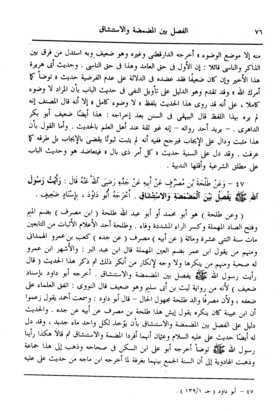 وَعَنْ " طَلْحَةَ " هُوَ: أَبُو مُحَمَّدٍ، أَوْ أَبُو عَبْدِ اللَّهِ؛ " طَلْحَةُ بْنُ مُصَرِّفٍ " بِضَمِّ الْمِيمِ وَفَتْحِ الصَّادِ الْمُهْمَلَةِ وَكَسْرِ الرَّاءِ الْمُشَدَّدَةِ وَفَاءٍ، " وَطَلْحَةُ " أَحَدُ الْأَعْلَامِ الْأَثْبَاتِ مِنْ التَّابِعِينَ، مَاتَ سَنَةَ اثْنَتَيْ عَشْرَةَ وَمِائَةٍ. عَنْ أَبِيهِ " مُصَرِّفٍ " عَنْ جَدِّهِ " كَعْبِ بْنِ عَمْرٍو " الْهَمْدَانِيِّ، وَمِنْهُمْ مَنْ يَقُولُ: ابْنُ عُمَرَ، بِضَمِّ الْعَيْنِ الْمُهْمَلَةِ. قَالَ ابْنُ عَبْدِ الْبَرِّ: وَالْأَشْهَرُ ابْنُ عَمْرٍو، لَهُ صُحْبَةٌ، وَمِنْهُمْ مَنْ يُنْكِرُهَا، وَلَا وَجْهَ لِإِنْكَارِ مَنْ أَنْكَرَ ذَلِكَ، ثُمَّ ذَكَرَ هَذَا الْحَدِيثَ: قَالَ: «رَأَيْتُ رَسُولَ اللَّهِ - صَلَّى اللَّهُ عَلَيْهِ وَسَلَّمَ - يَفْصِلُ بَيْنَ الْمَضْمَضَةِ وَالِاسْتِنْشَاقِ» أَخْرَجَهُ أَبُو دَاوُد بِإِسْنَادٍ ضَعِيفٍ؛؛ لِأَنَّهُ مِنْ رِوَايَةِ لَيْثِ بْنِ أَبِي سُلَيْمٍ وَهُوَ ضَعِيفٌ. قَالَ النَّوَوِيُّ: اتَّفَقَ الْعُلَمَاءُ عَلَى ضَعْفِهِ، وَلِأَنَّ مُصَرِّفًا وَالِدُ " طَلْحَةَ " مَجْهُولُ الْحَالِ. قَالَ أَبُو دَاوُد: وَسَمِعْت أَحْمَدَ يَقُولُ: زَعَمُوا أَنَّ ابْنَ عُيَيْنَةَ كَانَ يُنْكِرُهُ، يَقُولُ: أَيْشٍ هَذَا " طَلْحَةُ بْنُ مُصَرِّفٍ " عَنْ أَبِيهِ عَنْ جَدِّهِ.