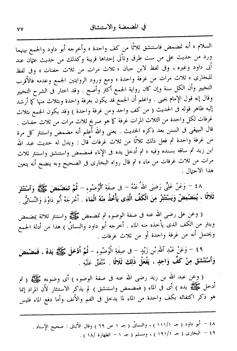 (48) - وَعَنْ عَلِيٍّ - رَضِيَ اللَّهُ عَنْهُ - فِي صِفَةِ الْوُضُوءِ - ثُمَّ «تَمَضْمَضَ - صَلَّى اللَّهُ عَلَيْهِ وَسَلَّمَ - وَاسْتَنْثَرَ ثَلَاثًا. يُمَضْمِضُ وَيَسْتَنْثِرُ مِنْ الْكَفِّ الَّذِي يَأْخُذُ مِنْهُ الْمَاءَ» . أَخْرَجَهُ أَبُو دَاوُد وَالنَّسَائِيُّ