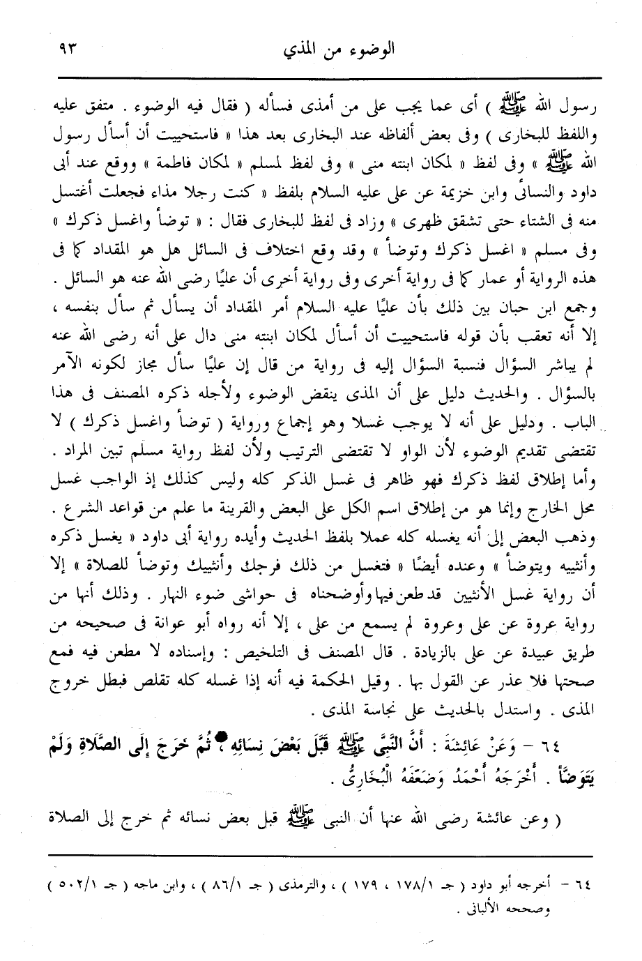 (64) - وَعَنْ عَائِشَةَ: «أَنَّ النَّبِيَّ - صَلَّى اللَّهُ عَلَيْهِ وَسَلَّمَ - قَبَّلَ بَعْضَ نِسَائِهِ، ثُمَّ خَرَجَ إلَى الصَّلَاةِ وَلَمْ يَتَوَضَّأْ» ، أَخْرَجَهُ أَحْمَدُ وَضَعَّفَهُ الْبُخَارِيُّ.