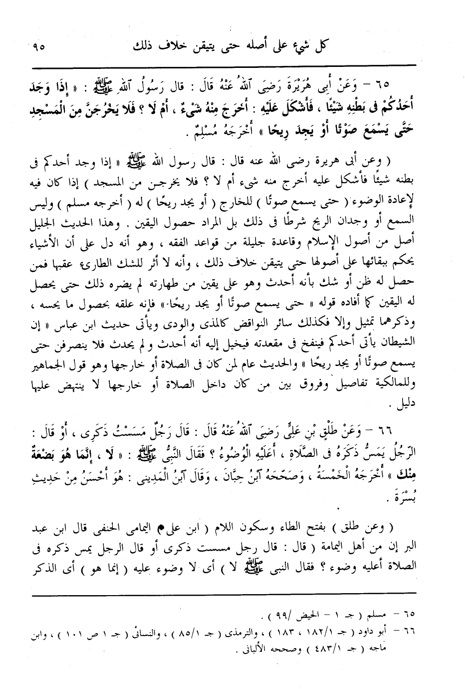 وَعَنْ " أَبِي هُرَيْرَة " - رَضِيَ اللَّهُ عَنْهُ - قَالَ: قَالَ رَسُولُ اللَّهِ - صَلَّى اللَّهُ عَلَيْهِ وَسَلَّمَ -: «إذَا وَجَدَ أَحَدُكُمْ فِي بَطْنِهِ شَيْئًا فَأَشْكَلَ عَلَيْهِ أَخَرَجَ مِنْهُ شَيْءٌ أَمْ لَا؟ فَلَا يَخْرُجَنَّ مِنْ الْمَسْجِدِ» إذَا كَانَ فِيهِ لِإِعَادَةِ الْوُضُوءِ [حَتَّى يَسْمَعَ صَوْتًا] لِلْخَارِجِ [أَوْ يَجِدَ رِيحًا] لَهُ، أَخْرَجَهُ مُسْلِمٌ وَلَيْسَ السَّمْعُ أَوْ وُجْدَانُ الرِّيحِ شَرْطًا فِي ذَلِكَ، بَلْ الْمُرَادُ حُصُولُ الْيَقِينِ، وَهَذَا الْحَدِيثُ الْجَلِيلُ أَصْلٌ مِنْ أُصُولِ الْإِسْلَامِ، وَقَاعِدَةٌ جَلِيلَةٌ مِنْ قَوَاعِدِ الْفِقْهِ، وَهُوَ أَنَّهُ دَلَّ عَلَى أَنَّ الْأَشْيَاءَ يُحْكَمُ بِبَقَائِهَا عَلَى أُصُولِهَا حَتَّى يَتَيَقَّنَ خِلَافَ ذَلِكَ، وَأَنَّهُ لَا أَثَرَ لِلشَّكِّ الطَّارِئِ عَقِبَهَا، فَمَنْ حَصَلَ لَهُ ظَنٌّ أَوْ شَكٌّ بِأَنَّهُ أَحْدَثَ وَهُوَ عَلَى يَقِينٍ مِنْ طَهَارَتِهِ لَمْ يَضُرَّهُ ذَلِكَ حَتَّى يَحْصُلَ لَهُ الْيَقِينُ، كَمَا أَفَادَهُ قَوْلُهُ [حَتَّى يَسْمَعَ صَوْتًا أَوْ يَجِدَ رِيحًا] فَإِنَّهُ عَلَّقَهُ بِحُصُولِ مَا يُحِسُّهُ، وَذِكْرُهُمَا تَمْثِيلٌ، وَإِلَّا فَكَذَلِكَ سَائِرُ النَّوَاقِضِ كَالْمَذْيِ وَالْوَدْيِ، وَيَأْتِي حَدِيثُ ابْنِ عَبَّاسٍ ": «إنَّ الشَّيْطَانَ يَأْتِي أَحَدَكُمْ فَيَنْفُخُ فِي مَقْعَدَتِهِ فَيُخَيَّلُ إلَيْهِ أَنَّهُ أَحْدَثَ وَلَمْ يُحْدِثْ، فَلَا يَنْصَرِفَنَّ حَتَّى يَسْمَعَ صَوْتًا أَوْ يَجِدَ رِيحًا» وَالْحَدِيثُ عَامٌّ لِمَنْ كَانَ فِي الصَّلَاةِ أَوْ خَارِجَهَا وَهُوَ قَوْلُ الْجَمَاهِيرِ.