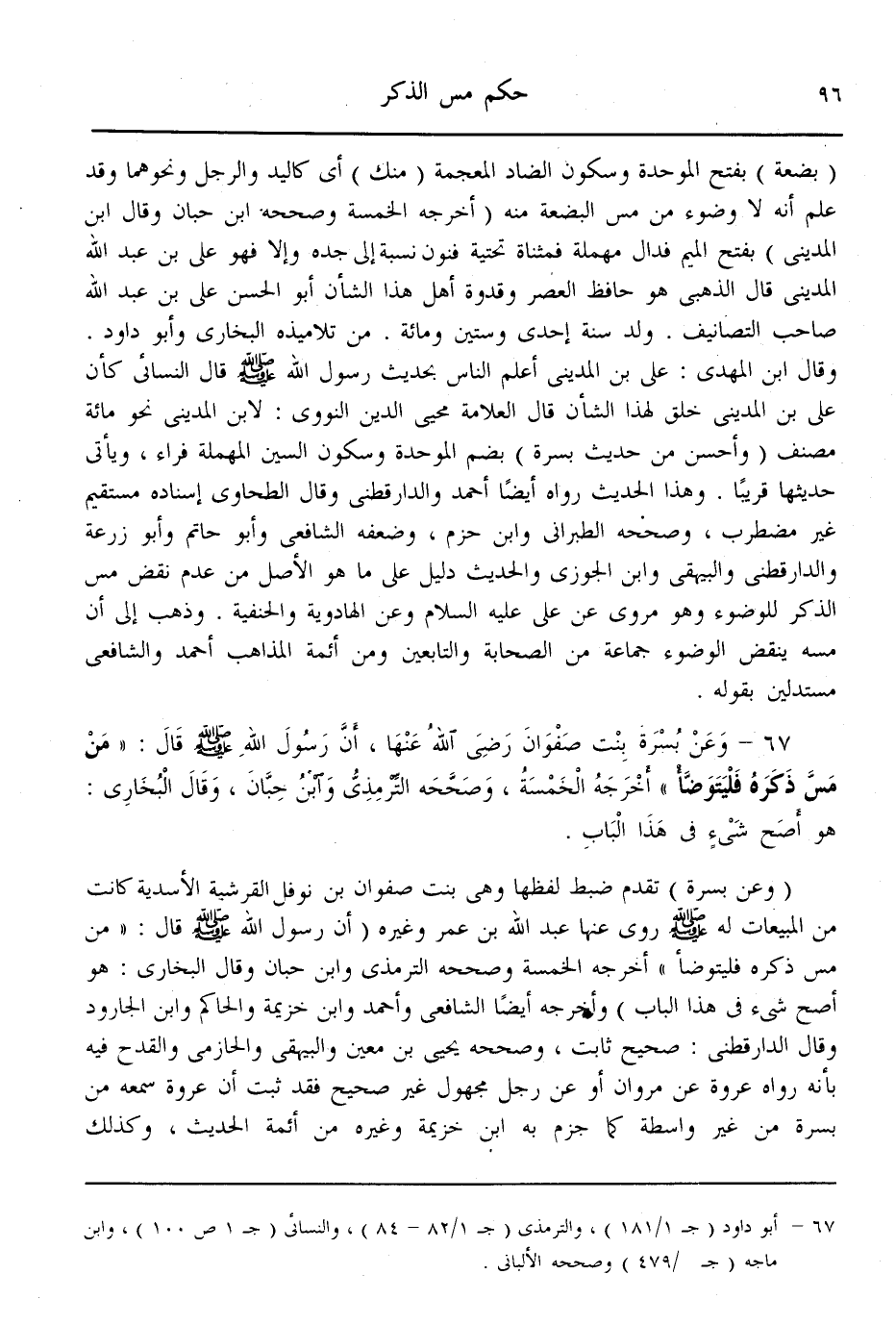 وَعَنْ بُسْرَةَ تَقَدَّمَ ضَبْطُ لَفْظِهَا وَهِيَ بِنْتُ صَفْوَانَ بْنِ نَوْفَلٍ "، الْقُرَشِيَّةُ الْأَسْدِيَةُ، كَانَتْ مِنْ الْمُبَايِعَاتِ لَهُ - صَلَّى اللَّهُ عَلَيْهِ وَسَلَّمَ -، رَوَى عَنْهَا عَبْدُ اللَّهِ بْنُ عُمَرَ "، وَغَيْرُهُ. أَنَّ رَسُولَ اللَّهِ - صَلَّى اللَّهُ عَلَيْهِ وَسَلَّمَ - قَالَ: «مَنْ مَسَّ ذَكَرَهُ فَلْيَتَوَضَّأْ» أَخْرَجَهُ الْخَمْسَةُ وَصَحَّحَهُ التِّرْمِذِيُّ وَابْنُ حِبَّانَ، وَقَالَ الْبُخَارِيُّ: هُوَ أَصَحُّ شَيْءٍ فِي هَذَا الْبَابِ وَأَخْرَجَهُ أَيْضًا الشَّافِعِيُّ، وَأَحْمَدُ وَابْنُ خُزَيْمَةَ؛ وَالْحَاكِمُ، وَابْنُ الْجَارُودِ، وَقَالَ الدَّارَقُطْنِيُّ: صَحِيحٌ ثَابِتٌ، وَصَحَّحَهُ يَحْيَى بْنُ مَعِينٍ، وَالْبَيْهَقِيُّ وَالْحَازِمِيُّ وَالْقَدْحُ فِيهِ بِأَنَّهُ رَوَاهُ عُرْوَةُ " عَنْ مَرْوَانَ " أَوْ عَنْ رَجُلٍ مَجْهُولٍ، غَيْرُ صَحِيحٍ، فَقَدْ ثَبَتَ أَنَّ عُرْوَةَ " سَمِعَهُ مِنْ بُسْرَةَ " مِنْ غَيْرِ وَاسِطَةٍ، كَمَا جَزَمَ بِهِ ابْنُ خُزَيْمَةَ وَغَيْرُهُ مِنْ أَئِمَّةِ الْحَدِيثِ، وَكَذَلِكَ