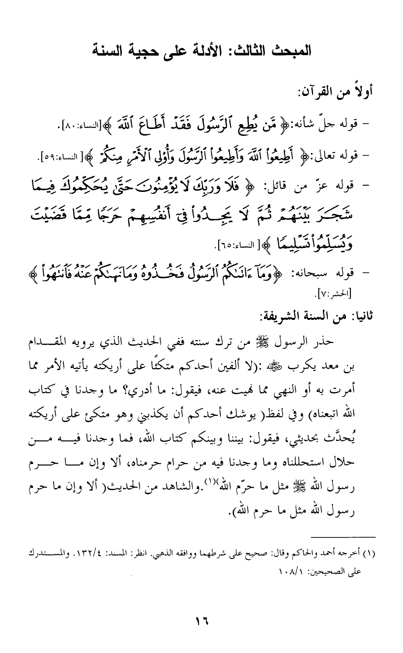 حذر الرسول صلى الله عليه وسلم من ترك سنته ففي الحديث الذي يرويه المقدام بن معد يكرب صلى الله عليه وسلم: (لا ألفين أحدكم متكئًا على أريكته يأتيه الأمر مما أمرت به أو النهي مما نهيت عنه، فيقول: ما أدري؟ ما وجدنا في كتاب الله اتبعناه) وفي لفظ (يوشك أحدكم أن يكذبني وهو متكئ على أريكته يُحدَّث بحديثي، فيقول: بيننا وبينكم كتاب الله، فما وجدنا فيه من حلال استحللناه وما وجدنا فيه من حرام حرمناه، ألا وإن ما حرم رسول الله صلى الله عليه وسلم مثل ما حرّم الله) (1) .والشاهد من الحديث (ألا وإن ما حرم رسول الله مثل ما حرم الله) .