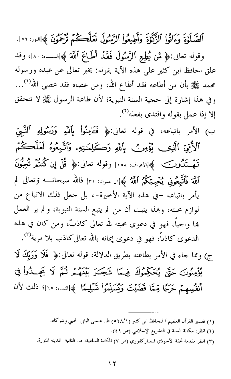 ب) الأمر باتباعه، في قوله تعالى: {فَآمِنُوا بِاللَّهِ وَرَسُولِهِ النَّبِيِّ الْأُمِّيِّ الَّذِي يُؤْمِنُ بِاللَّهِ وَكَلِمَاتِهِ وَاتَّبِعُوهُ لَعَلَّكُمْ تَهْتَدُونَ} [الأعراف: 158] وقوله تعالى {قُلْ إِنْ كُنْتُمْ تُحِبُّونَ اللَّهَ فَاتَّبِعُونِي يُحْبِبْكُمُ اللَّهُ} [آل عمران: 31] فالله سبحانه وتعالى لم يأمر باتباعه -في هذه الآية الأخيرة-، بل جعل ذلك الاتباع من لوازم محبته، وبهذا يثبت أن من لم يتبع السنة النبوية، ولم ير العمل بها واجباً، فهو في دعوى محبته لله تعالى كاذبٌ، ومن كان في هذه الدعوى كاذباً، فهو في دعوى إيمانه بالله تعالىكاذب بلا مرية (3) .