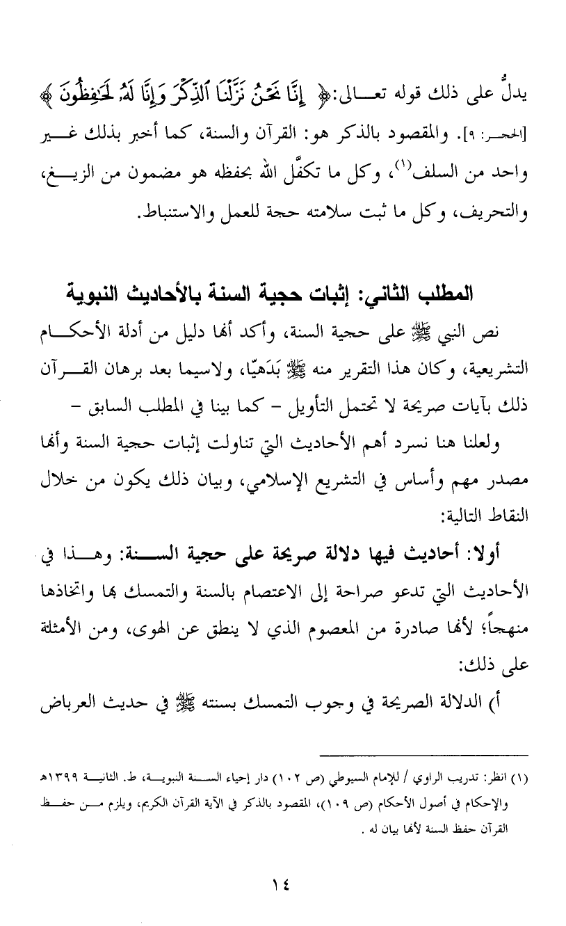 (1) انظر: تدريب الراوي / للإمام السيوطي (ص 102) دار إحياء السنة النبوية، ط. الثانية 1399? والإحكام في أصول الأحكام (ص 109) ، المقصود بالذكر في الآية القرآن الكريم، ويلزم من حفظ القرآن حفظ السنة لأنها بيان له.