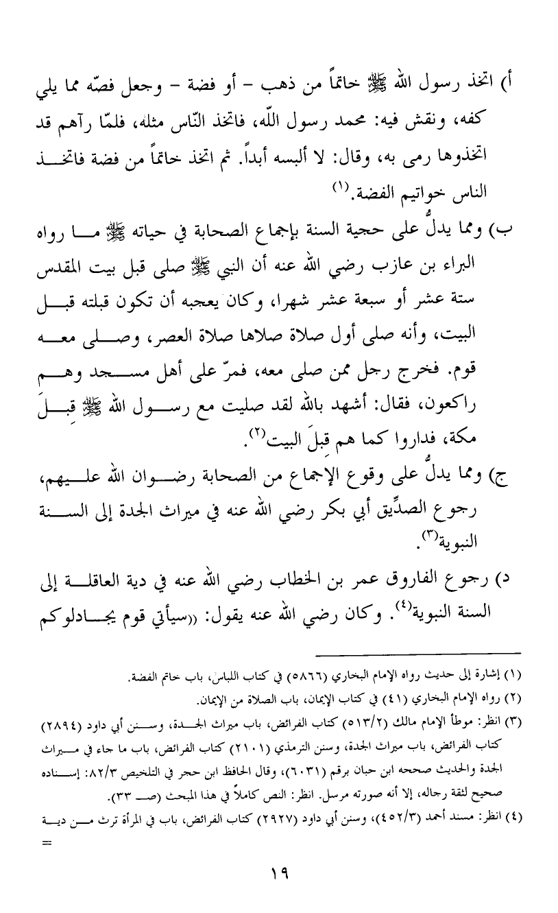 ج) ومما يدلُّ على وقوع الإجماع من الصحابة رضوان الله عليهم، رجوع الصدِّيق أبي بكر رضي الله عنه في ميراث الجدة إلى السنة النبوية (3) .