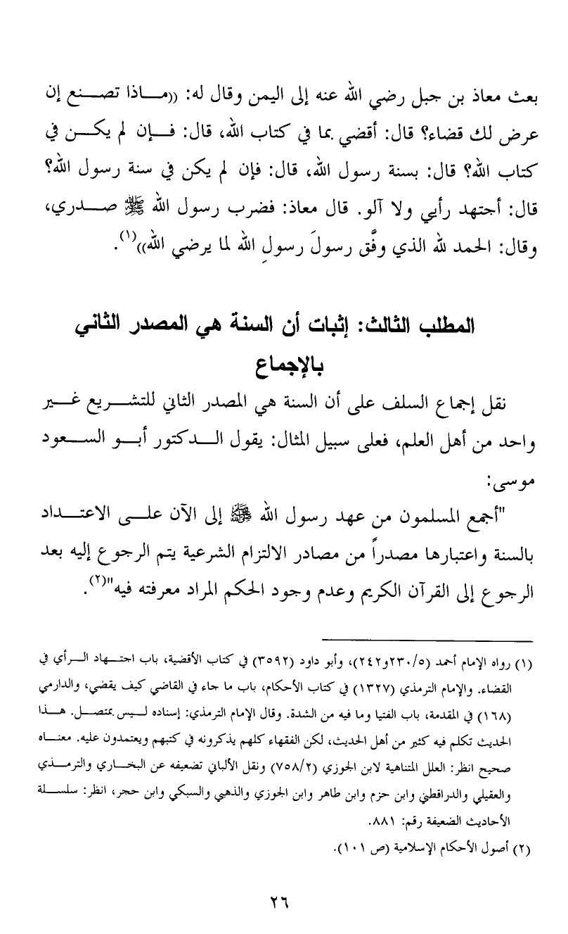 (1) رواه الإمام أحمد (5/230و242) ، وأبو داود (3592) في كتاب الأقضية، باب اجتهاد الرأي في القضاء. والإمام الترمذي (1327) في كتاب الأحكام، باب ما جاء في القاضي كيف يقضي، والدارمي (168) في المقدمة، باب الفتيا وما فيه من الشدة. وقال الإمام الترمذي: إسناده ليس بمتصل. هذا الحديث تكلم فيه كثير من أهل الحديث، لكن الفقهاء كلهم يذكرونه في كتبهم ويعتمدون عليه. معناه صحيح انظر: العلل المتناهية لابن الجوزي (2/758) ونقل الألباني تضعيفه عن البخاري والترمذي والعقيلي والدراقطني وابن حزم وابن طاهر وابن الجوزي والذهبي والسبكي وابن حجر، انظر: سلسلة الأحاديث الضعيفة رقم: 881.