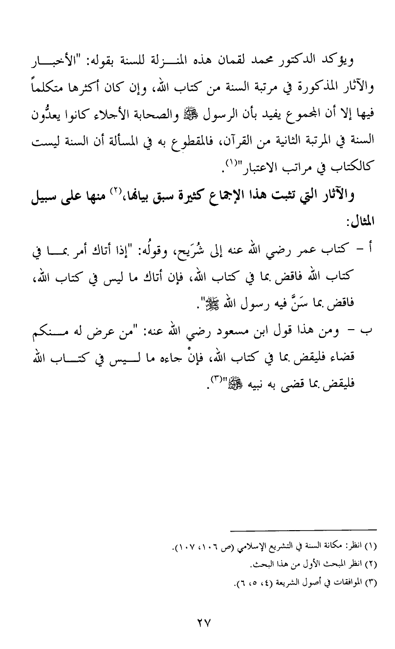ويؤكد الدكتور محمد لقمان هذه المنزلة للسنة بقوله: "الأخبار والآثار المذكورة في مرتبة السنة من كتاب الله، وإن كان أكثرها متكلماً فيها إلا أن المجموع يفيد بأن الرسول صلى الله عليه وسلم والصحابة الأجلاء كانوا يعدُّون السنة في المرتبة الثانية من القرآن، فالمقطوع به في المسألة أن السنة ليست كالكتاب في مراتب الاعتبار" (1) .