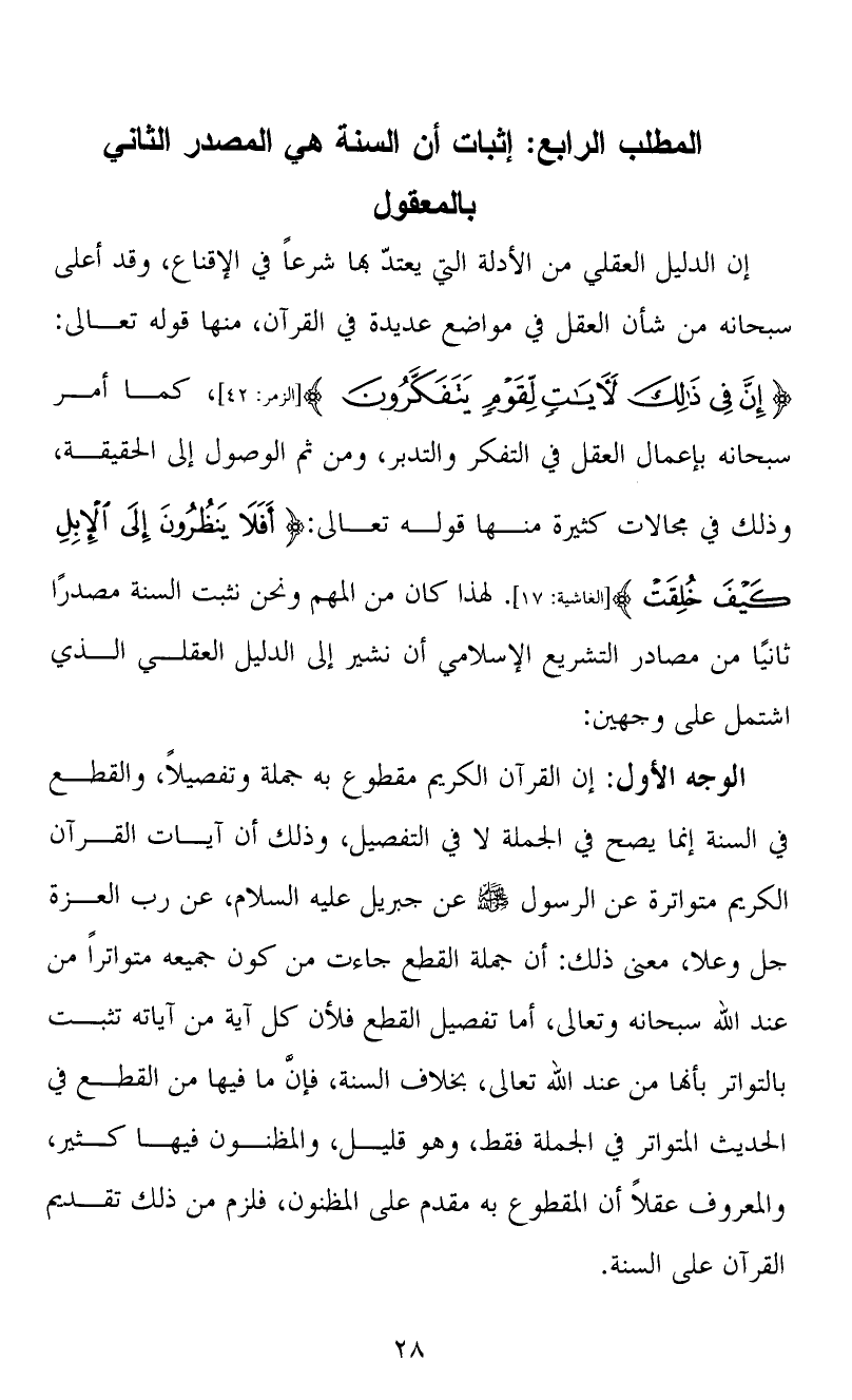 الطلب الرابع: إثبات أن السنة هي المصدر الثاني بالمعقول