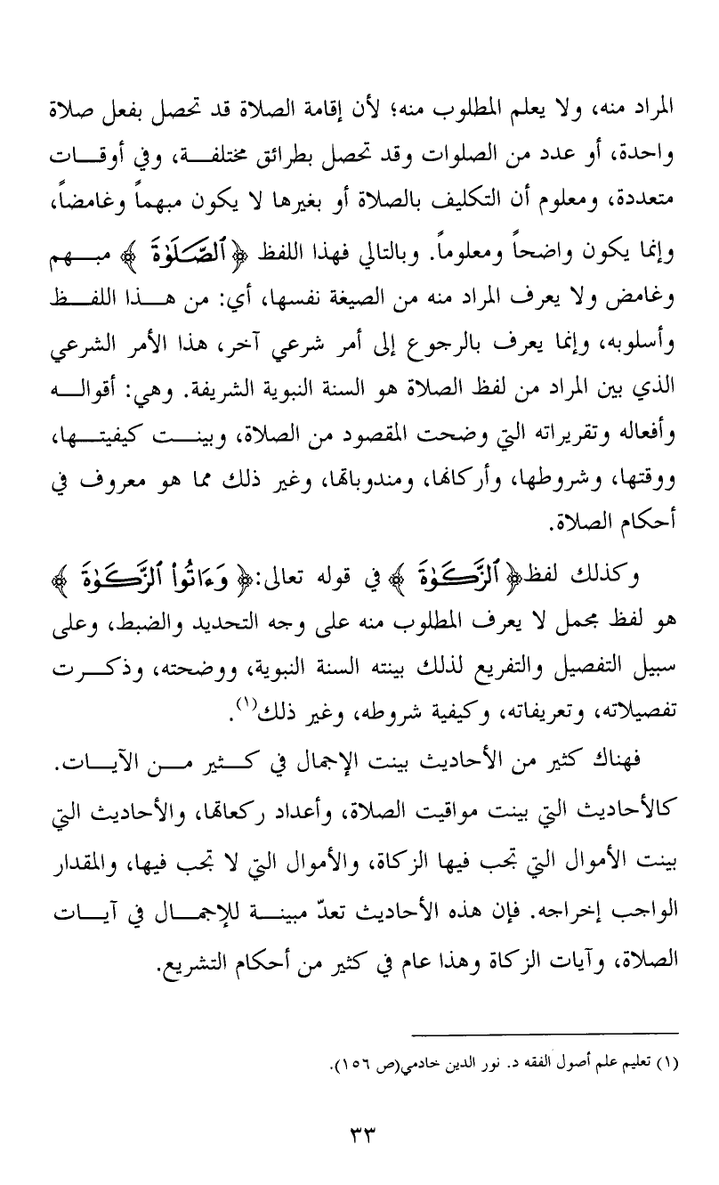 المراد منه، ولا يعلم المطلوب منه؛ لأن إقامة الصلاة قد تحصل بفعل صلاة واحدة، أو عدد من الصلوات وقد تحصل بطرائق مختلفة، وفي أوقات متعددة، ومعلوم أن التكليف بالصلاة أو بغيرها لا يكون مبهماً وغامضاً، وإنما يكون واضحاً ومعلوماً. وبالتالي فهذا اللفظ {الصَّلاةَ} مبهم وغامض ولا يعرف المراد منه من الصيغة نفسها، أي: من هذا اللفظ وأسلوبه، وإنما يعرف بالرجوع إلى أمر شرعي آخر، هذا الأمر الشرعي الذي بين المراد من لفظ الصلاة هو السنة النبوية الشريفة. وهي: أقواله وأفعاله وتقريراته التي وضحت المقصود من الصلاة، وبينت كيفيتها، ووقتها، وشروطها، وأركانها، ومندوباتها، وغير ذلك مما هو معروف في أحكام الصلاة.