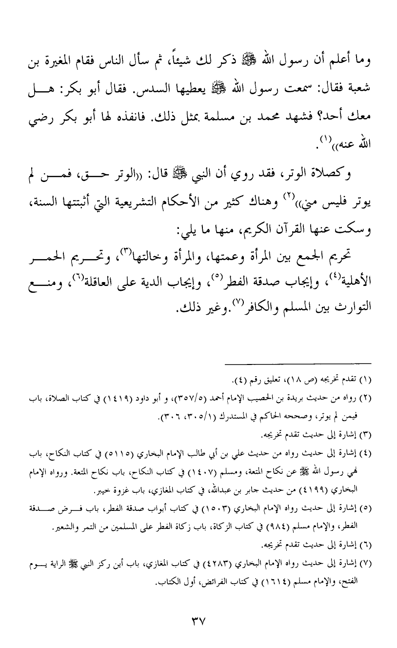وكصلاة الوتر، فقد روي أن النبي صلى الله عليه وسلم قال: "الوتر حق، فمن لم يوتر فليس مني" (2) وهناك كثير من الأحكام التشريعية التي أثبتتها السنة، وسكت عنها القرآن الكريم، منها ما يلي: