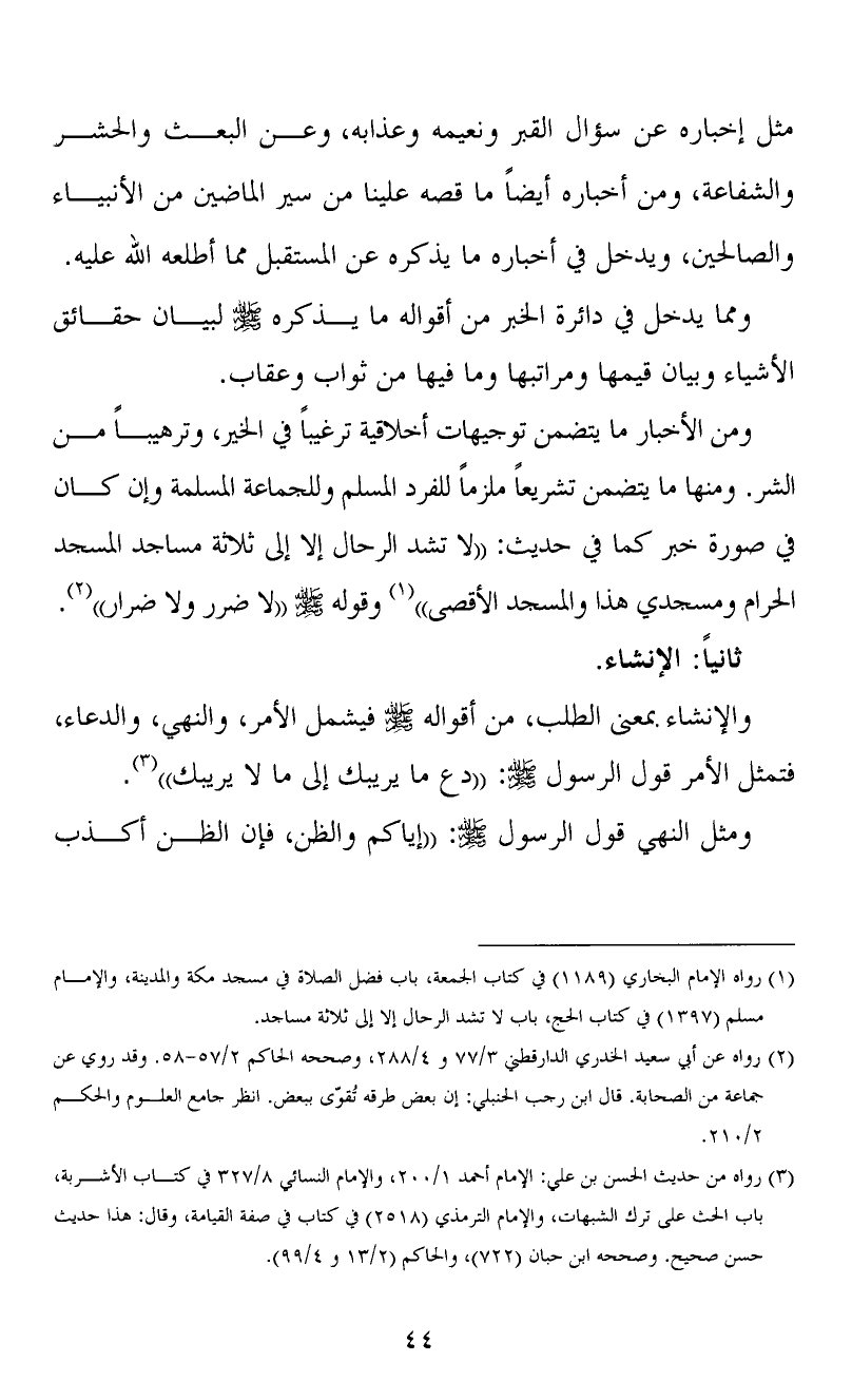 ومن الأخبار ما يتضمن توجيهات أخلاقية ترغيباً في الخير، وترهيباً من الشر. ومنها ما يتضمن تشريعاً ملزماً للفرد المسلم وللجماعة المسلمة وإن كان في صورة خبر كما في حديث: "لا تشد الرحال إلا إلى ثلاثة مساجد المسجد الحرام ومسجدي هذا والمسجد الأقصى" (1) وقوله صلى الله عليه وسلم "لا ضرر ولا ضرار" (2) .