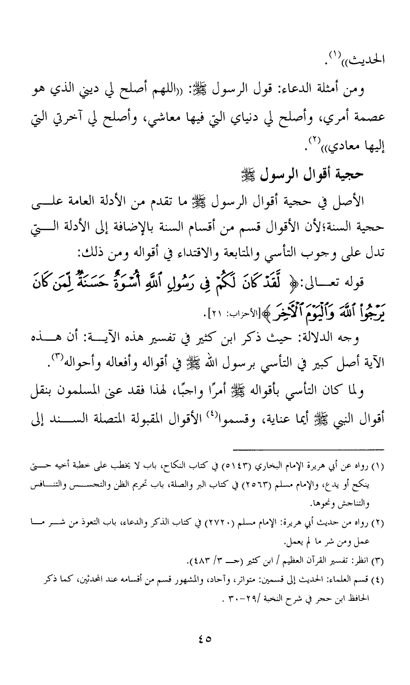 وجه الدلالة: حيث ذكر ابن كثير في تفسير هذه الآية: أن هذه الآية أصل كبير في التأسي برسول الله صلى الله عليه وسلم في أقواله وأفعاله وأحواله (3) .