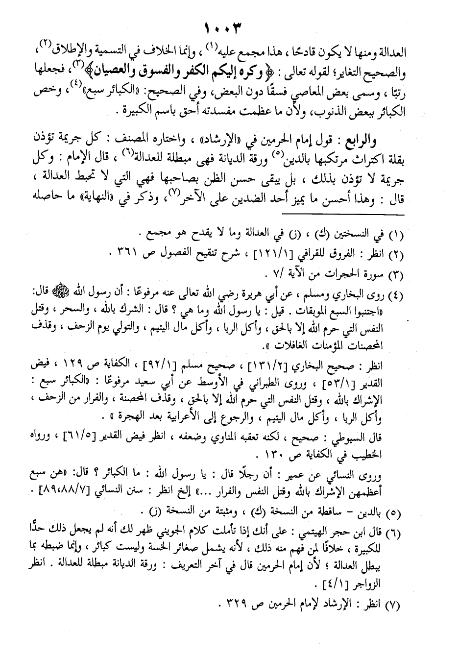 والرابع: قول إمام الحرمين في (الإرشاد) واختاره المصنف: كل جريمة تؤذن بقلة اكتراث مرتكبها بالدين ورقة الديانة فهي مبطلة للعدالة قال الإمام: وكل جريمة لا تؤذن بذلك، بل يبقى حسن الظن بصاحبها فهي التي لا تحبط العدالة، قال: وهذا أحسن ما يميز أحد الضدين على الآخر، وذكر في (النهاية) ما حاصله