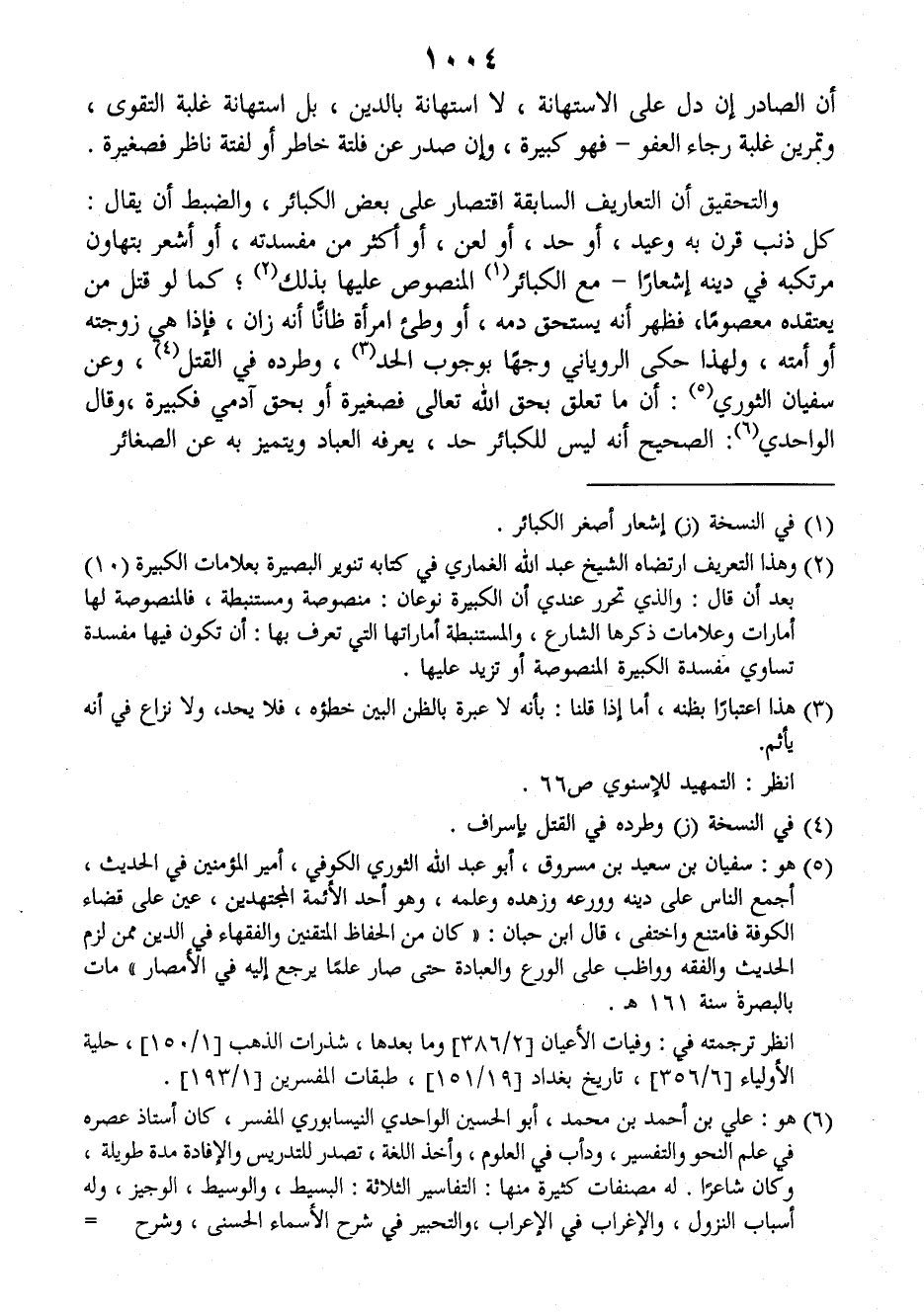 والتحقيق أن التعاريف السابقة اقتصار على بعض الكبائر، والضبط أن يقال: كل ذنب قرن به وعيد، أو حد، أو لعن، أو أكثر من مفسدته أو أشعر بتهاون مرتكبه في دينه إشعارا - مع الكبائر المنصوص عليها بذلك كما لو قتل من يعتقده معصوما فظهر أنه يستحق دمه، أو وطئ امرأة ظانا أنه زان، فإذا هي زوجته أو أمته، ولهذا حكى الروياني وجها بوجوب الحد وطرده في القتل وعن سفيان الثوري: أن ما تعلق بحق الله تعالى فصغيرة أو بحق آدمي فكبيرة، وقال الواحدي: الصحيح أنه ليس للكبائر حد، يعرفه العباد ويتميز به عن الصغائر