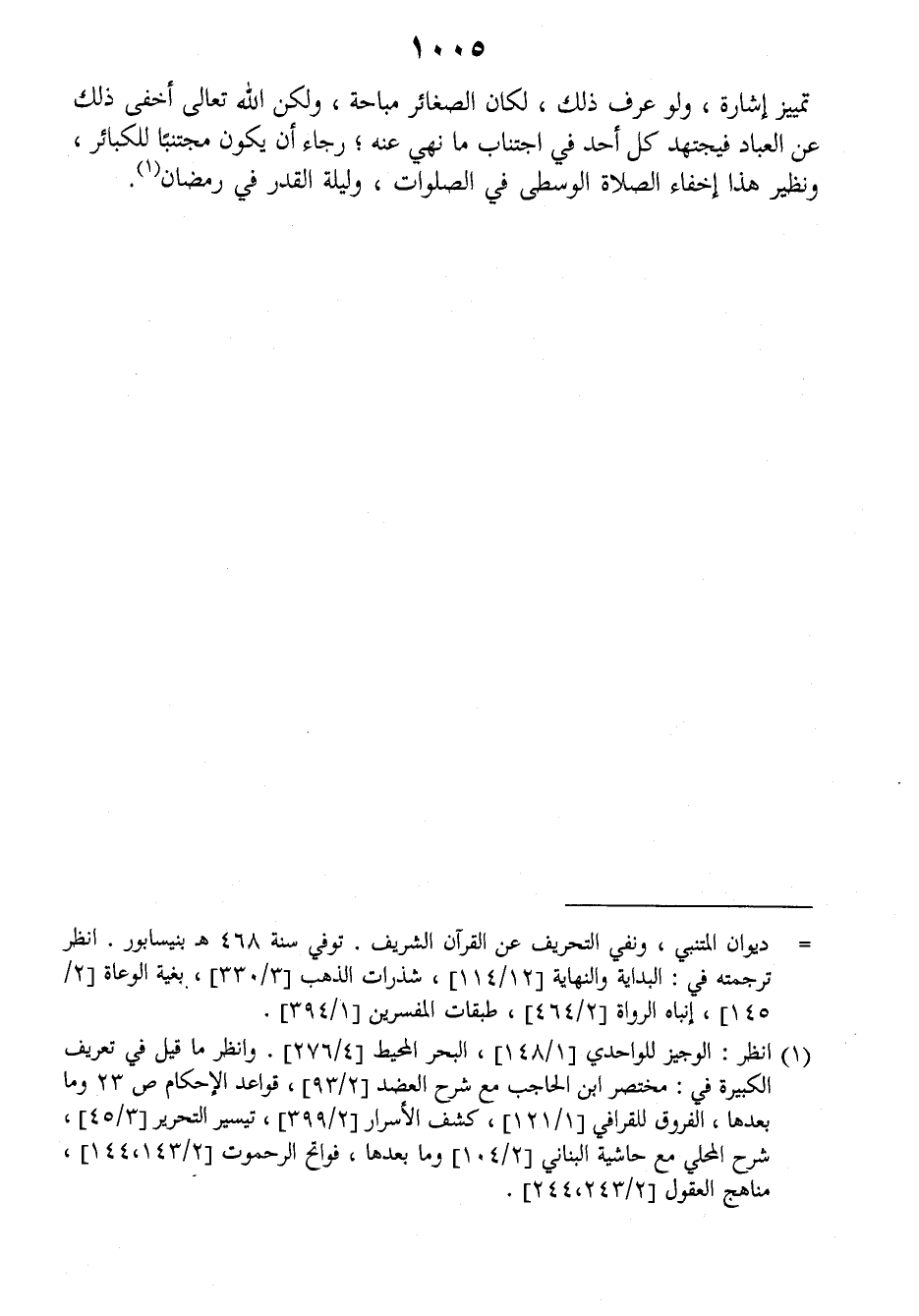 تمييز إشارة ولو عرف ذلك، لكان الصغائر مباحة ولكن الله تعالى أخفى ذلك عن العباد فيجتهد كل أحد في اجتناب ما نهي عنه، رجاء أن يكون مجتنبا للكبائر ونظير هذا إخفاء الصلاة الوسطى في الصلوات وليلة القدر في رمضان.