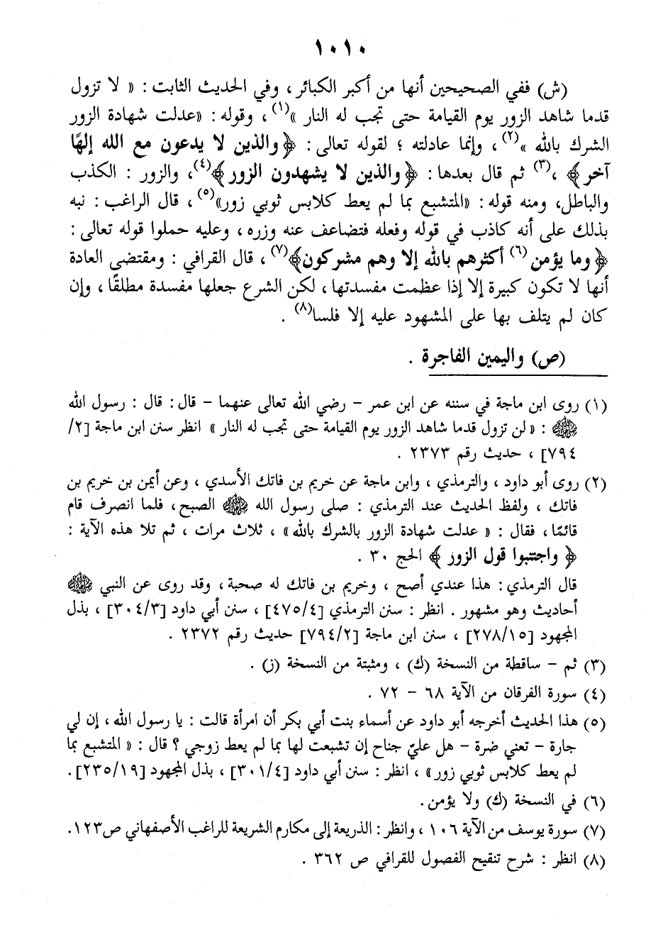 (ش) ففي الصحيحين أنها من أكبر الكبائر، وفي الحديث الثابت: ((لا تزول قدما شاهد الزور يوم القيامة حتى تجب له النار)) وقوله: ((عدلت شهادة الزور الشرك بالله)) وإنما عادلته، لقوله تعالى: {والذين لا يدعون مع الله إلها آخر} ثم قال بعدها: {والذين لا يشهدون الزور} والزور: الكذب والباطل، ومنه قوله: ((المتشبع بما لم يعط كلابس ثوبي زور)) قال الراغب: نبه بذلك على أنه كاذب في قوله وفعله فتضاعف عنه وزره، وعليه حملوا قوله تعالى: {وما يؤمن أكثرهم بالله إلا وهم مشركون} قال القرافي: ومقتضى العادة أنها لا تكون كبيرة إلا إذا عظمت مفسدتها، لكن الشرع جعلها مفسدة مطلقا، وإن كان لم يتلف بها على المشهود عليه إلا فلسا.