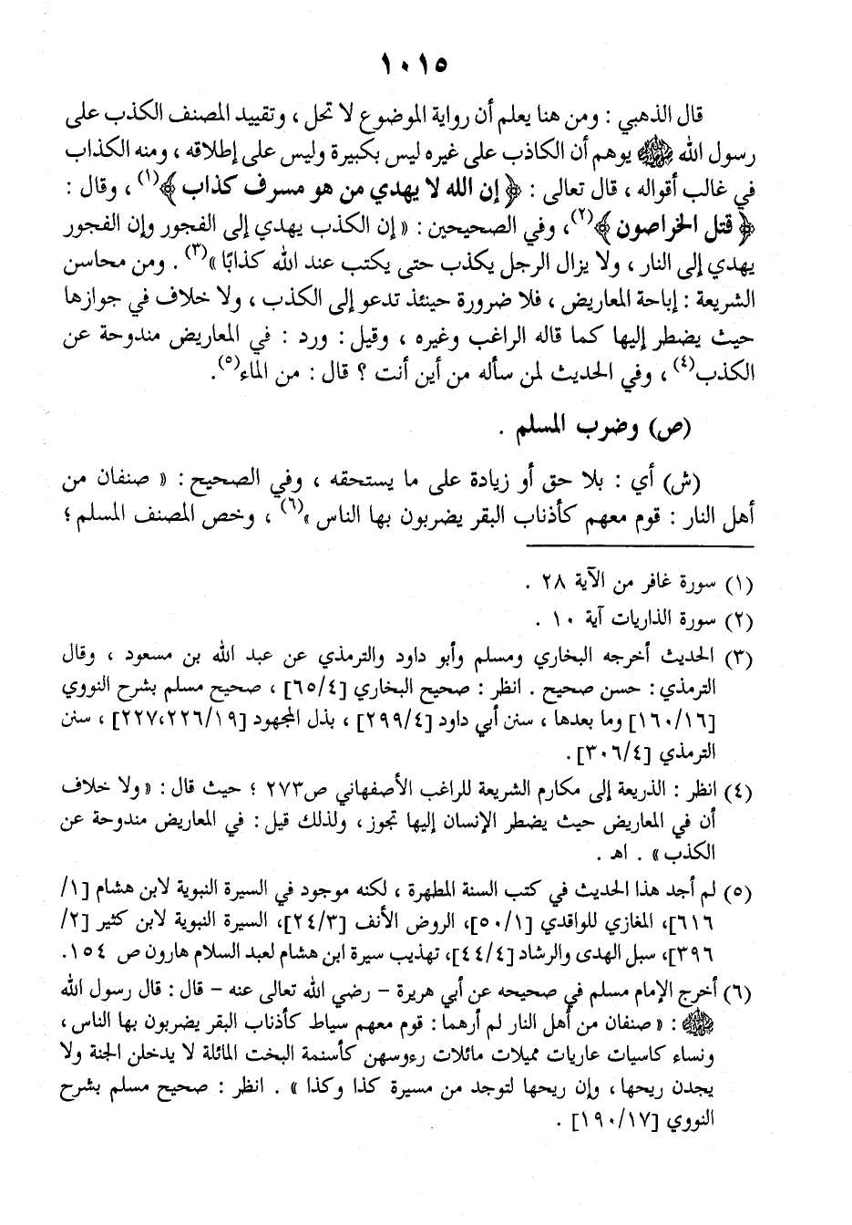 قال الذهبي: ومن هنا يعلم أن رواية الموضوع لا تحل، وتقييد المصنف الكذب على رسول الله صلى الله عليه وسلم يوهم أن الكاذب على غيره ليس بكبيرة وليس على إطلاقه ومنه الكذاب في غالب أقواله قال تعالى: {إن الله لا يهدي من هو مسرف كذاب} وقال: {قتل الخراصون} وفي الصحيحين: ((إن الكذب يهدي إلى الفجور وإن الفجور يهدي إلى النار، ولا يزال الرجل يكذب حتى يكتب عند الله كذابا)) ومن محاسن الشريعة: إباحة المعاريض فلا ضرورة حينئذ تدعو إلى الكذب، ولا خلاف في جوازها حيث يضطر إليها كما قاله الراغب وغيره وقيل: ورد: في المعاريض مندوحة عن الكذب وفي الحديث لمن سأله من أين أنت؟ قال: ((من الماء)).