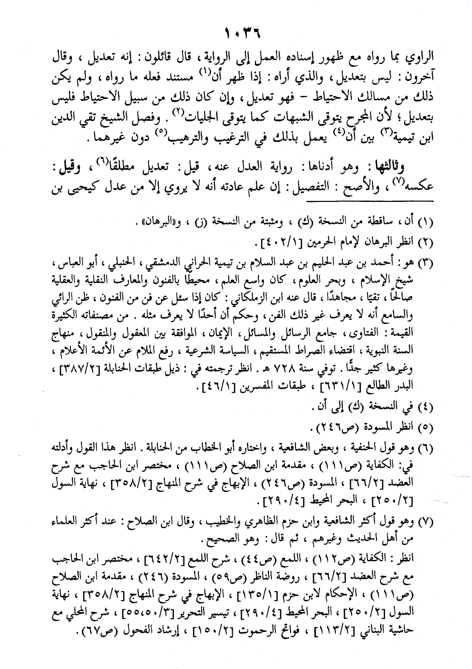 الراوي بما رواه مع ظهور إسناده العمل إلى الرواية قال قائلون: إنه تعديل، وقال آخرون: ليس بتعديل والذي أراه: إذا ظهر أن مستند فعله ما رواه ولم يكن ذلك من مسالك الاحتياط - فهو تعديل، وإن كان ذلك في سبيل الاحتياط فليس بتعديل، لأن المجرح يتوقى الشبهات كما يتوقى الجليات وفصل الشيخ تقي الدين ابن تيمية بين أن يعمل بذلك في الترغيب والترهيب دون غيرهما.