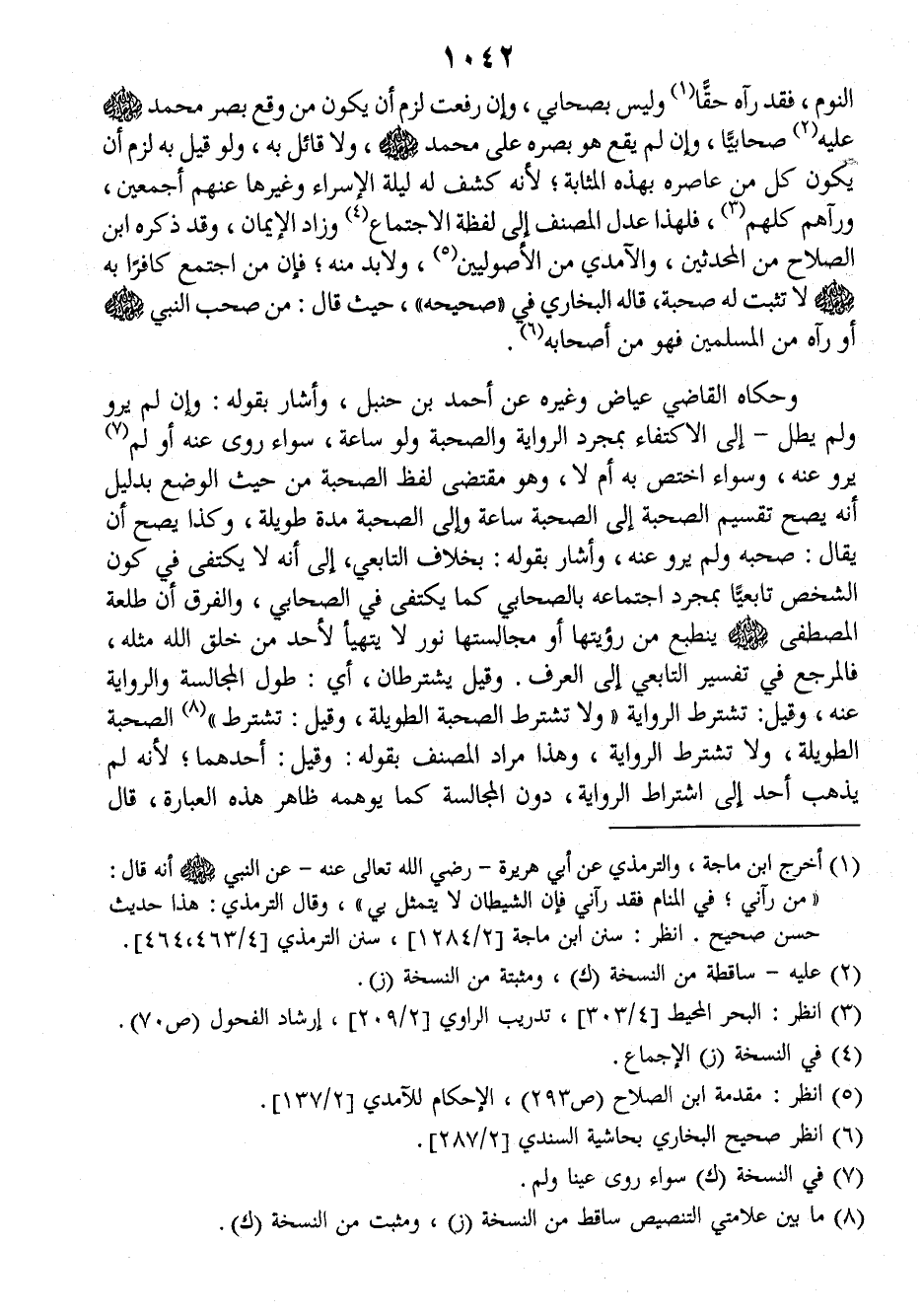 النوم فقد رآه حقا وليس بصحابي وإن رفعت لزم أن يكون من وقع بصر محمد صلى الله عليه وسلم عليه صحابيا وإن لم يقع بصره على محمد صلى الله عليه وسلم ولا قائل به ولو قيل به لزم أن يكون كل من عاصره بهذه المثابة، لأنه كشف له ليلة الإسراء وغيرها عنهم أجمعين ورآهم كلهم فلهذا عدل المصنف إلى لفظة الاجتماع وزاد الإيمان وقد ذكره ابن الصلاح من المحدثين، والآمدي من الأصوليين ولا بد منه، فإن من اجتمع كافرا به صلى الله عليه وسلم لا تثبت له صحبة، قاله البخاري في (صحيحه) حيث قال: من صحب النبي صلى الله عليه وسلم أو رآه من المسلمين فهو من أصحابه.