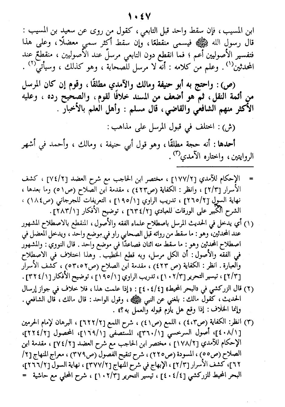 (ص): واحتج به أبو حنيفة ومالك والآمدي مطلقا، وقوم إن كان المرسل من أئمة النقل، ثم هو أضعف من المسند خلافا لقوم، والصحيح رده، وعليه الأكثر منهم الشافعي والقاضي، قال مسلم: وأهل العلم بالأخبار.