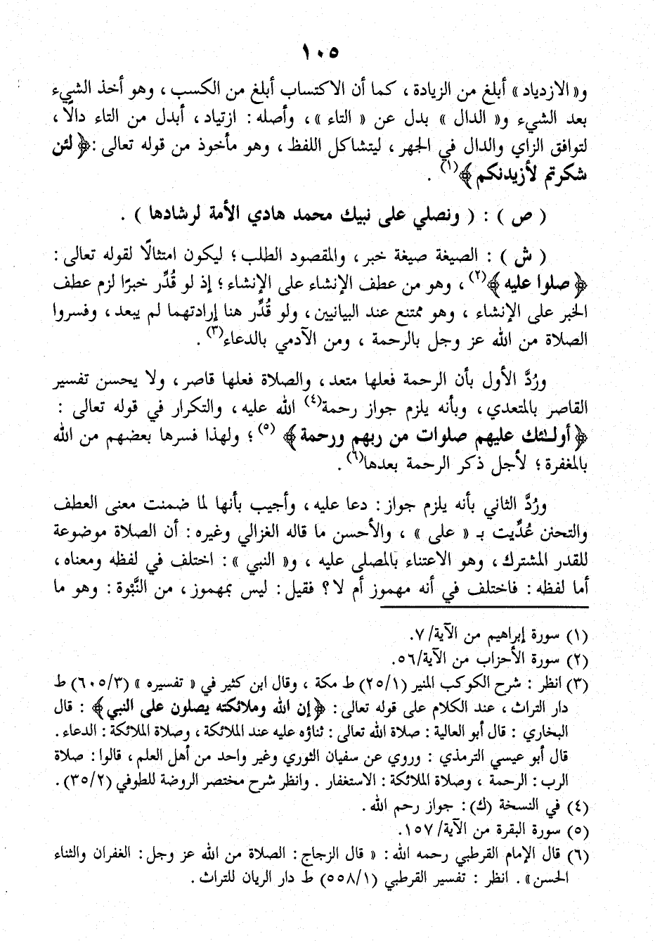 ورُدَّ الأوَّلُ بأنَّ الرحمةَ فِعْلُها مُتَعَدٍّ، والصلاةَ فِعْلُها قاصِرٌ، ولا يَحْسُنُ تفسيرُ القَاصِرِ بالمُتَعَدِّي، وبأنَّه يَلْزَمُ جوازُ رحمةِ اللهِ عليه والتَّكْرَارُ في قَوْلِهِ تعالَى: {أُولَئِكَ عَلَيْهِمْ صَلَوَاتٌ مِنْ رَبِّهِمْ وَرَحْمَةٌ}. ولهذا فَسَّرَها بعضُهم من اللهِ بالمغفرةِ؛ لأجلِ ذِكْرِ الرحمةِ بعدَها.