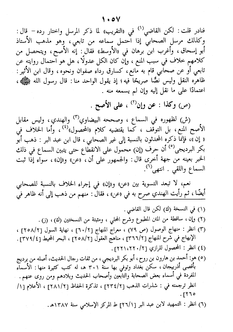 (ش) لظهوره في السماع، وصححه البيضاوي والهندي، وليس مقابل الأصح المنع، بل التوقف، كما يقتضيه كلام (المحصول) وأما الخلاف في (إن) فإنما ذكره المحدثون بالنسبة إلى غير الصحابي، قال ابن عبد البر: ذهب أبو بكر البرديجي أن حرف (إن) محمول على الانقطاع حتى يتبين السماع في ذلك الخبر بعينه من جهة أخرى قال: والجمهور على أن (عن) و (إن) سواء إذا ثبت السماع واللقي. انتهى.