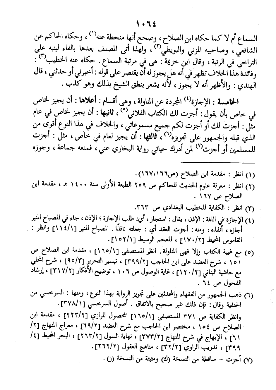 الخامسة: الإجازة المجردة عن المناولة، وهي أقسام: أعلاها: أن يجيز لخاص في خاص بأن يقول: أجزت لك الكتاب الفلاني، ثانيها: أن يجيز لخاص في عام مثل: أجزت لك أو أجزت لكم جميع مسموعاتي، والخلاف في هذا النوع أقوى من الذي قبله والجمهور على تجويزه، ثالثها: أن يجيز لعام في خاص، مثل: أجزت للمسلمين أو أجزت، لمن أدرك حياتي رواية البخاري عني، فمنعه جماعة، وجوزه