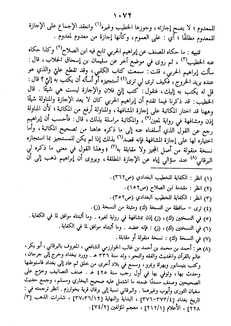 تنبيه: ما حكاه المصنف عن إبراهيم الحربي تابع فيه ابن الصلاح وكذا حكاه عنه الخطيب، ثم روى في موضع آخر عن سليمان بن إسحاق الجلاب، قال: سألت إبراهيم الحربي قلت: سمعت كتاب الكلبي، وقد تقطع علي والذي هو عنده يريد الخروج، فكيف ترى لي ترى أستجيزه أو أسأله أن يكتب به إلي؟ قال: قل له يكتب به إليك، فتقول: كتب إلي فلان والإجازة ليست هي شيئا. قال الخطيب: قد ذكرنا فيما تقدم أن إبراهيم الحربي كان لا يعد الإجازة والمناولة شيئا وههنا قد اختار المكاتبة على إجازة المشافهة والمناولة أرفع من المكاتبة لأن المناولة إذن ومشافهة في رواية لمعين، والمكاتبة مراسلة بذلك، قال: فأحسب أن إبراهيم رجع عن القول الذي أسلفناه عنه إلى ما ذكره ههنا من تصحيح المكاتبة وأما اختياره لها على إجازة المشافهة فإنه قصد بذلك، إذا لم يكن للمستجيز بما استجازه نسخة منقولة من أصل المجيز ولا مقابلة به (وهذا القول في معنى ما ذكره لي البرقاني عند سؤالي إياه عن الإجازة المطلقة، ويروى أن إبراهيم ذهب إلى أن