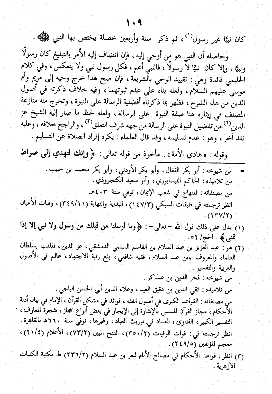 وحاصِلُه أنَّ النبيَّ هو مَن أُوحِيَ إليه، فإنِ انْضَافَ إليه الأمرُ بالتبليغِ كانَ رسولاً ونبيًّا، وإلاَّ كانَ نبيًّا لا رسولاً، فالنبيُّ أعمُّ، فكلُّ رسولٍ نَبِيٌّ ولا يَنْعَكِسُ. وفي كلامِ الحَلِيمِيِّ فائدةٌ، وهي: تقييدُ الوحيِ بالشريعةِ، فإنْ صَحَّ هذا خَرَجَ وَحْيُهُ إلى مَرْيَمَ وأُمِّ مُوسَى عليهم السلامُ، ولَعَلَّه بَنَاهُ على عَدَمِ ثُبُوتِهِما، وفيه خِلافٌ ذَكَرْتُهُ في أُصُولِ الدِّينِ مِن هذا الشرحِ.
