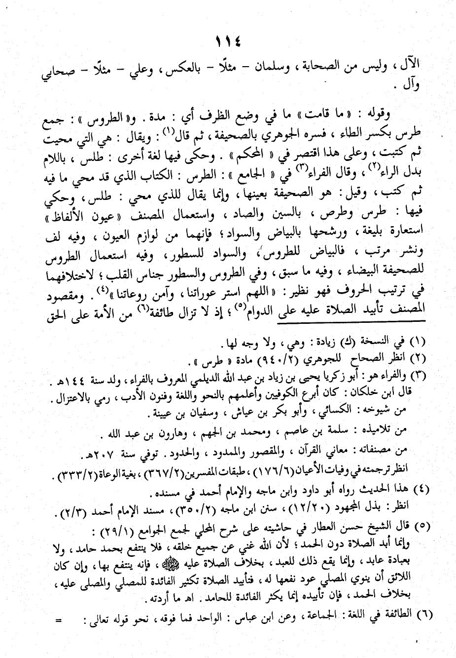 وقولُه: (ما قَامَتْ) ما: في وَضعِ الظرفِ؛ أي: مُدَّةَ. و (الطُّرُوسُ): جَمْعُ طِرْسٍ، بكسرِ الطاءِ، فَسَّرَهُ الجَوْهَرِيُّ بالصَّحِيفَةِ، ثمَّ قالَ: ويُقالُ: هي التي مُحِيَتْ ثمَّ كُتِبَتْ. وعلى هذا اقْتَصَرَ في (المُحْكَمِ)، وحكَى فيها لغةً أُخْرَى: طِلْسٌ، باللامِ بدلَ الراءِ، وقالَ الفَرَّاءُ في (الجامِعِ): الطِّرْسُ: الكتابُ الذي قد مُحِيَ ما فيه ثمَّ كُتِبَ. وقيل: هو الصحيفةُ بعينِها، وإنما يُقالُ للذي مُحِيَ: طُلِسَ، وحُكِيَ فيها: طِرْسٌ وطِرْصٌ، بالسينِ والصادِ، واستعمالُ المصنِّفِ (عُيُونَ الألفاظِ) استعارةٌ بليغةٌ، ورَشَّحَها بالبياضِ والسوادِ؛ فإنَّهما من لَوَازِمِ العيونِ، وفيه لَفٌّ ونَشْرٌ مُرَتَّبٌ، فالبَياضُ للطُّرُوسِ، والسوادُ للسطورِ، وفيه استعمالُ الطُّرُوسِ للصحيفةِ البَيضاءِ، وفيه ما سَبَقَ، وفي الطُّرُوسِ والسُّطُورِ جِناسُ القَلْبِ؛ لاخْتِلافِهِما في ترتيبِ الحروفِ، فهو نظيرُ: (اللَّهُمَّ اسْتُرْ عَوْرَاتِنَا وآمِنْ رَوْعَاتِنا) .. ومقصودُ المُصَنِّفِ تَابِيدُ الصلاةِ عليه على الدوامِ؛ إذ لا تَزَالُ طائفةٌ مِن الأُمَّةِ على الحقِّ